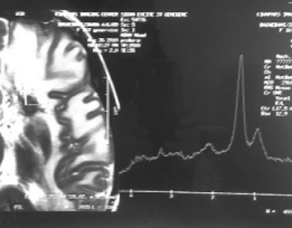 Case 1: A 15-year-old girl with acute lymphoblastic leukemia diagnosed in 2010 was receiving maintenance treatment. Three weeks ago, she referred to a hospital with headache, nausea and vomiting. CT scan of the brain demonstrated low density of mass like a lesion of the left parietal lobes cortico medullary junction accompanies with mild vasogenic edema and no enhancement after contrast media administration. Findings were non specific in CT scan. MRI was applied and on the obtained images there was left parietal corticomedullary junction intermediate signal intensity lesion with vasogenic edema on T2 which as a bright intermediated signal in T1 and low signal intensity peripheral edema (Figure 1A, 1B), follow in contrast media administration remarkable enhancements of lesions are seen (Figure 1C). These findings were compatible with toxoplasmosis and lymphoma. MRI spectroscopy (MRS) was done and increasing of lactate and lipid and low choline were seen in the spectrum of MRS which are specific for necrotizing abscess (Figure 2). Ig M antibody against Toxoplasma by Chemiluminesans (Roche kit) was 8 IU/mL (reference range: non reactive < 0.8; intermitant 0.8- 1; reactive > 1) and Ig G was 4 IU/mL (reference range: Non reactive ˂ 1; intermitant 1- 3; reactive ˃ 3). The patient prescribed with pyrimethamin, sulfadiazine and leucoverin.