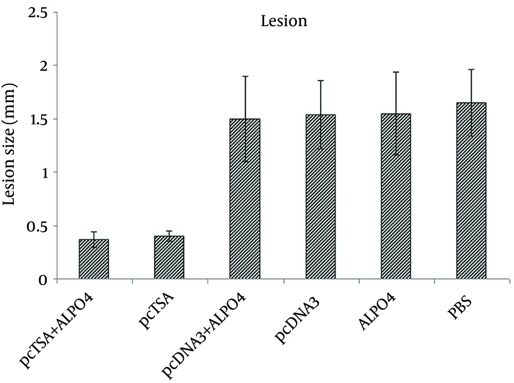 Taken together, this study showed that the TSA-DNA vaccine formulated in alum with stimulation of cellular immune response could be an excellent candidate for further vaccine development against Leishmania major. However, there were no significant differences observed between the pcTSA and pcTSA + AlPO4 groups.
