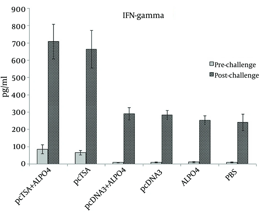 In this study, we showed that immunization and co-immunization of mice with pcTSA and pcTSA + AlPO4 improves spleen cell proliferation and induces Th1-specific immune responses; manifested by the increased antigen-specific serum IFN-γ levels when compared with the DNA vaccine alone (group 3). Our results are comparable with Coler et al. findings which showed that administration of polyprotein vaccine enhances cellular immune responses. They showed that enhanced antigen-specific proliferative response increases IFN-γ production (26).
