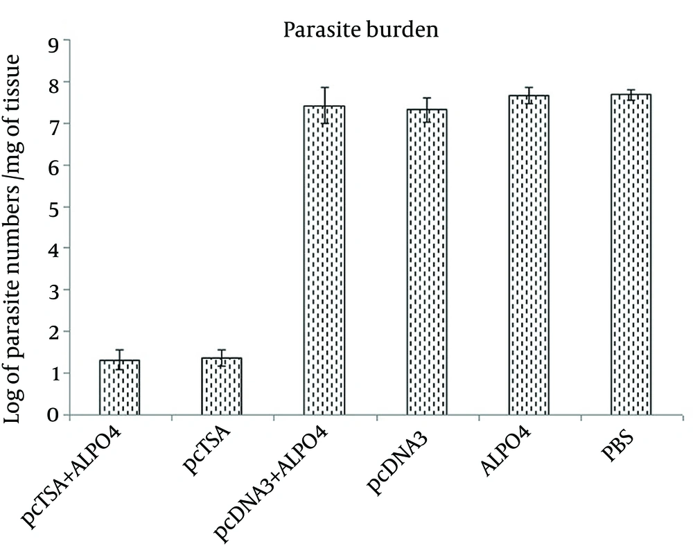 Six to eight week-old BALB/c female mice were purchased from Razi Institute (Karaj, Iran) and maintained under standard conventional conditions. The mice were divided into 6 different groups, each containing 5 mice receiving different regimens of DNA immunization. Aluminum phosphate was used for preparation of TSA plasmid vaccine formulation. The process was carried out according to the method of Bradford et al., by which kinetic of adsorption was determined after mixing 100 μg of pcTSA plasmid with 45 μg of aluminum phosphate in 100 μL of PBS solution for each injection (18).