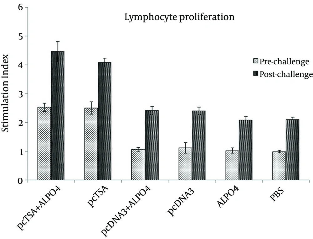 To further investigate the phenotype (Th1/Th2 pattern) of the immune response elicited by immunization of SLA, suspensions of spleen cells from immunized mice and control groups were isolated and re-stimulated in vitro with 20 µg/mL of SLA. As shown in Figure 1, mice immunized and co-immunized with pcTSA and pcTSA + AlPO4 (group 5 and 6), induced a much better specific proliferation response, in comparison with the control groups (P < 0.05). This shows the ability of pcTSA and pcTSA + AlPO4 to induce spleen cell proliferation as a marker of cellular immune responses, whereas no significant difference were observed between pcTSA and pcTSA + AlPO4 (P > 0.05). The same results were obtained after the challenge, so that the immunized mice in pcTSA and pcTSA + AlPO4 groups showed significantly increased lymphocyte proliferation compared to the control groups (P < 0.05) (P < 0.05).
