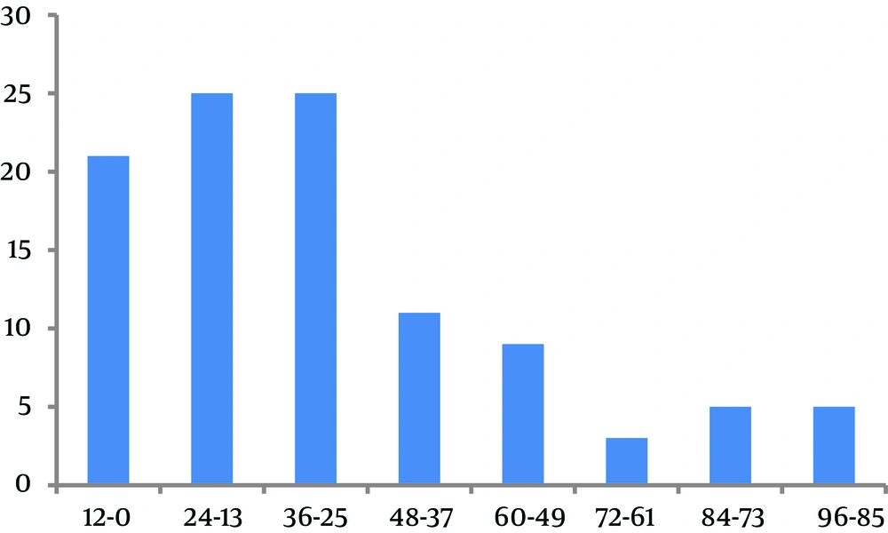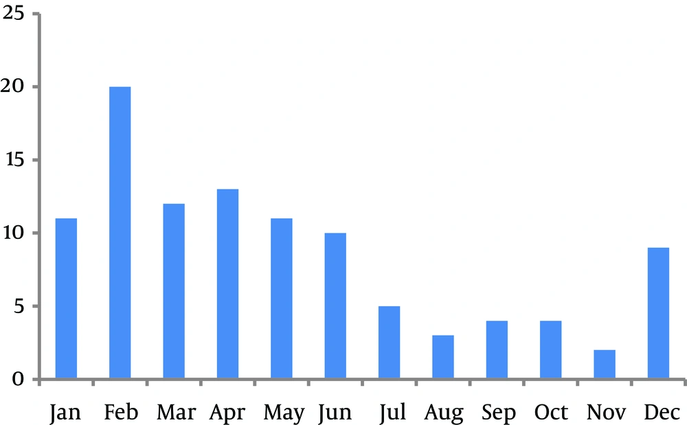 In total, 104 patients were enrolled in our study. Amongst these cases, 66 (63.5%) were boys and 38 (36.5%) girls (male to female ratio = 1.7:1). The age of the patients ranged from 3 months to 8 years (mean ± SD = 33.6 ± 24.2 months). Figure 1 shows the age distribution of the patients with KD. Furthermore, 86 (82.7%) patients were from urban and 18 (17.3%) patients from rural areas. More patients were seen during winter (41.3%) and spring (11.5%), but this difference was not significant (P = 0.33). Most patients were referred to the hospital during February and April (Figure 2).