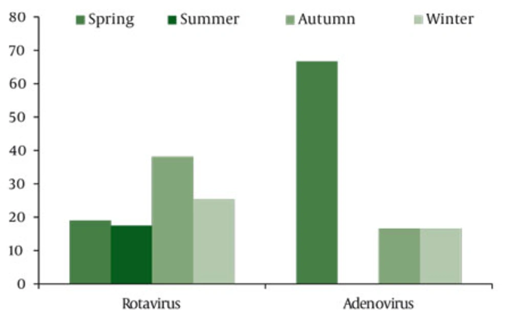 Rotavirus cases were more common between the months of October and March. The highest prevalence was seen in autumn (38.1%) and winter (25.4%). In studies carried out in our country, rotavirus cases are more frequently seen in winter (12, 22) ,but in another study, the detection rate was highest in spring (25). In the Asian rostavirus surveillance study, rotavirus cases were observed with higher frequency between December and March in northern regions, but a seasonal increase was not observed in countries with tropical climates (26). In similar studies in the U.S (14), the highest prevalence was in winter, but in the Busu study in South Africa (9), the highest prevalence of rotavirus was in autumn and winter, which is consistent with our results. Geographical location seems to be important for determining the seasonal variability of rotavirus-related gastroenteritis. The seasonal distribution of adenovirus gastroenteritis showed a greater prevalence of infection in spring (66.7%). Unfortunately, the number of cases was too small to draw any significant conclusion about the seasonality or other epidemiological data of adenovirus infection.