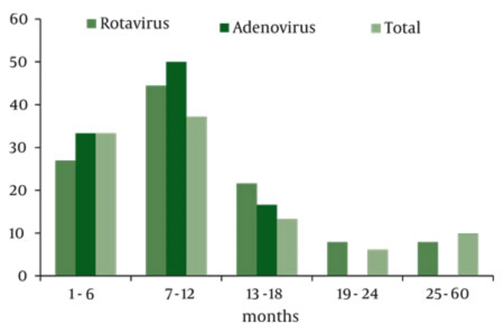 In rotavirus-infected group, the mean age was 11.57 ± 9.21 months (range, 2-48 months). In adenovirus-infected group, the mean age was 8.17 ± 4 months (range, 2-14 months) (Figure 1).