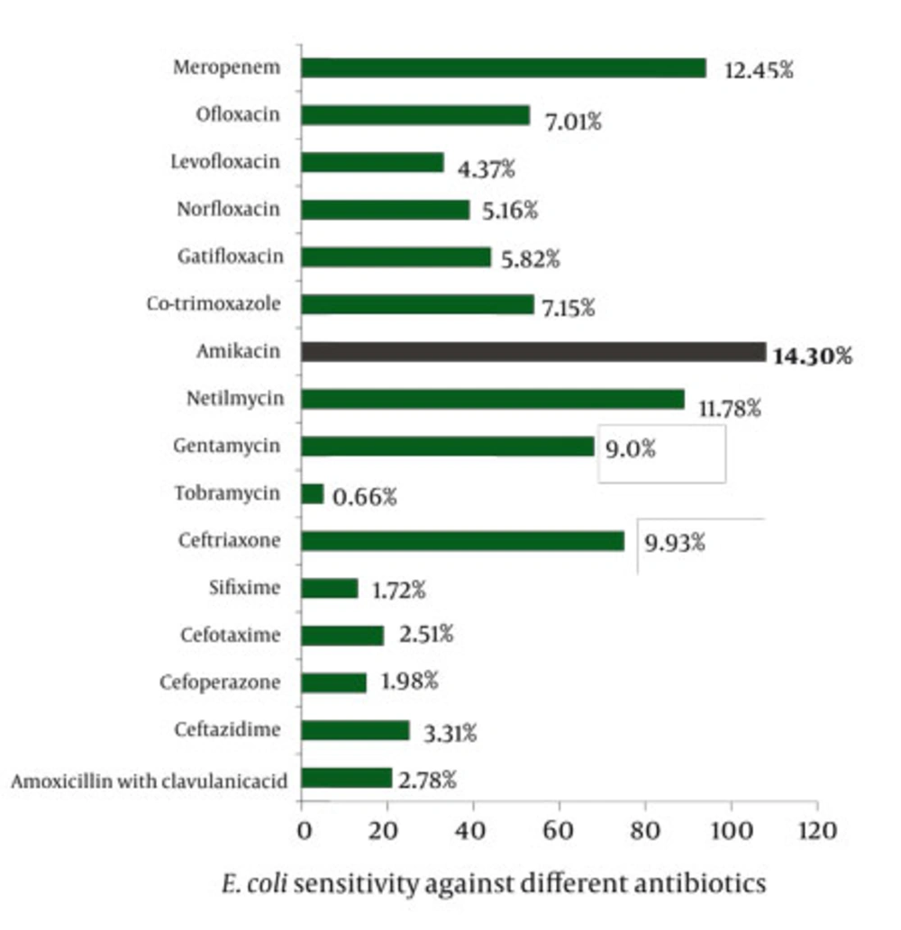 E.coli was the commonest bacteria (63.44%) in UTI patients, but with a different rate obtained from other populations in U.S.A. study (75.5% - 87.0%) (19, 20), where the number are 68.69% and 83.0% as seen by Rayan et al. in general population in India (21). On the contrary, in the report of Nabeela et al., Klebsiella sp. and Proteus sp. were responsible for 16% and 11% of all urinary tract infections, respectively (22). This variation may be attributed to different life style, poor healthcare system, lack of education, and inadequate availability of water, and also may be due to geographical variations.