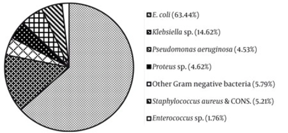 Majority of women are recurrently infected within one year (5). Compared to males, young sexually active females and teenage students girls are mostly infected by UTI (10.57% higher). In this group, most prominent pathogens are Escherichia coli (32.8%), Klebsiella pneumoniae (22.4%), and Staphylococcus aureus (15.1%) (6). E. coli cause 75 – 90% of uncomplicated UTIs (7) whereas S. saprophyticus frequently causes UTI in younger women at estimated rate of 5 – 15%(8). Golechha and Solanki (9) performed a bacteriological study on preoperative urine samples of 100 urolithiasis cases in India. E.coli was encountered as the commonest pathogen recovered from pre-operative urine and stone cultures (32.25% and 21.73%, respectively) followed by Pseudomonas aeruginosa (22.58% and 17.39%, respectively). Enterococcus and other Gram negative rods other than E.coli have also been implicated in some cases (10).