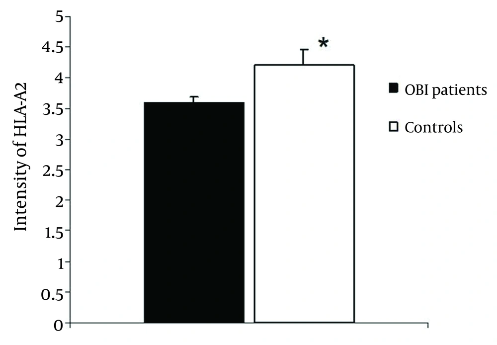 Yao also identified that peripheral blood HBV specific CD8+ T cells, which recognize HLA-A2, play important roles in complete clearance of HBV (22). Gu and colleagues reported that the prevalence of HLA-A2 positive cases was not different in the patients infected with various HBV genotypes (23). Based on our and aforementioned studies it may be concluded that defects in antigen presentation due to decreased HLA-A2 expression in OBI patients may be responsible for impaired immune responses against HBV, which lead to impairments in eradication of HBV infection from hepatocytes. In summary, these results showed that the intensity of HLA-A2 expression significantly decreased in OBI patients in comparison to healthy controls. Accordingly, defects in antigen presentation may lead to progression of HBV infection towards OBI. Further investigations on the expressions and polymorphisms of other important related immune factors in OBI patients in future studies are recommended.
