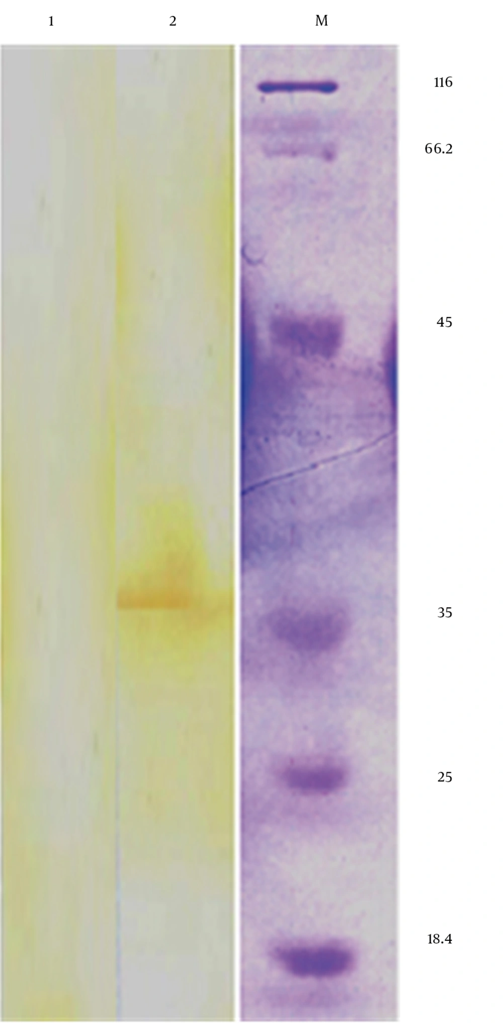 Detection of<i>Mtb 32C-HBHA </i>Protein in Transfected Cells by Western Blot Analysis Showing a Protein Band With a Size of Approximately 35.5 kDa (lane 2) in Transfected Cells But not in Non-transfected Cells (lane 1).