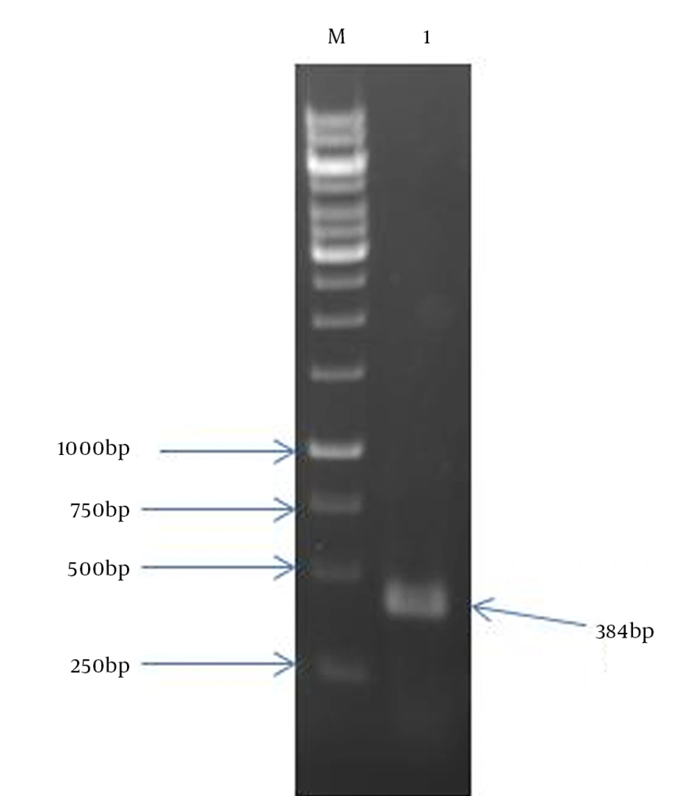 The amplified HBHA, along with pcDNA3.1 (+) (Invitrogen, USA) was digested by restriction enzymes XhoI and NotI. Digested products were purified by AccuPrep gel purification kit (Bioneer, South Korea) according to the manufacturer’s recommendations. For HBHA gene insertion into pcDNA3.1 (+) vector, ligation solution containing 1 µL T4 DNA ligase (Fermentas, Germany), 1.5 µL 10x buffer, 2.5 µL digested and purified pcDNA 3.1 (+), 9 µL digested and purified HBHA PCR product, 1 µL PEG mixed and incubated overnight at 16°C. Competent bacteria strain JM109 (Promega, USA) was transformed as described previously (15). The presence of HBHA was confirmed by colony-PCR using specific primers and restriction enzyme analysis.