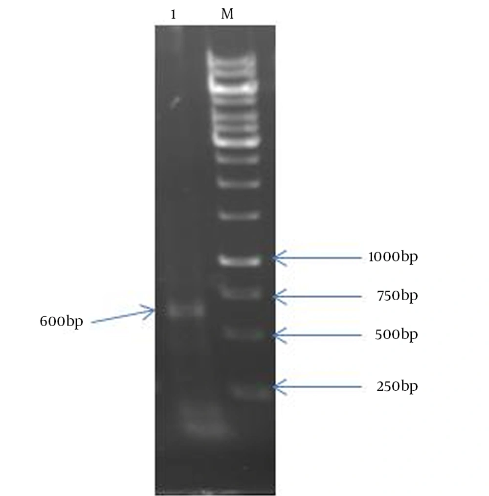 Lane 1: a 600 bp fragment of <i>HBHA</i>; Lane M: 1 kb DNA size marker.