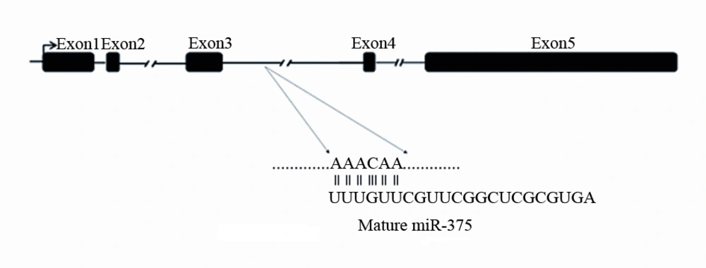 Bioinformatic and in silico analysis represented a miR-375 putative target site in the third intron of SOX2OT sequence (NR-004053.2) by miRcode, Gene Runner, NCBI databases (Figure 3). The SOX2OT gene contains five exons that intron-less gene of SOX2 embedded within the third intron of SOX2OT.
