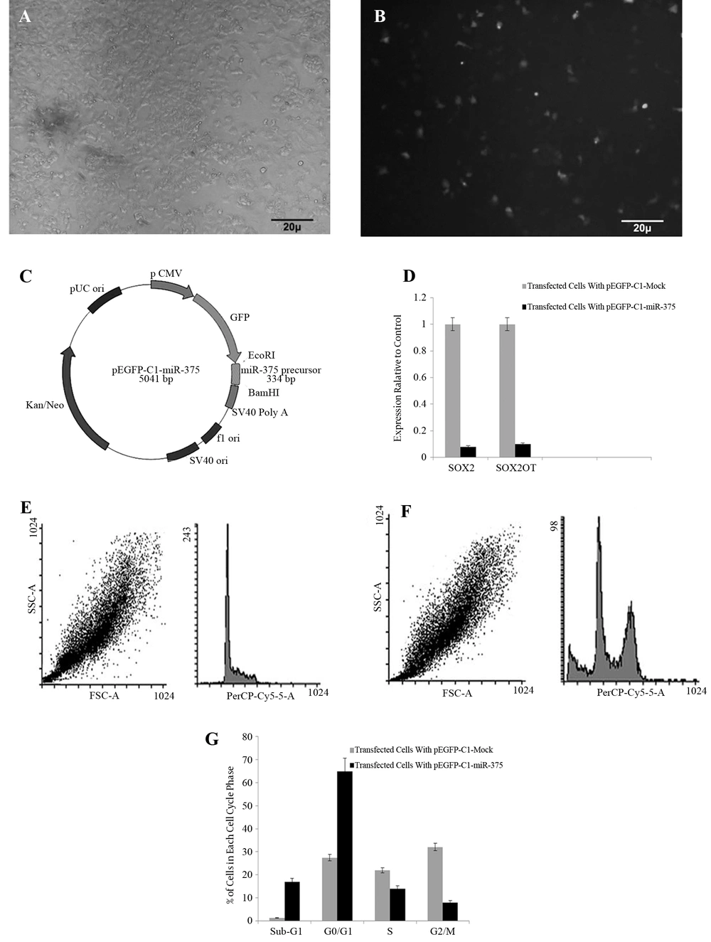 A, Phase contrast micrograph X20 and; B, fluorescence micrograph using green filter show the expression of GFP in transfected NT2 cells 48 hours after transfection with pEGFP-C1-miR-375. that represent cellular clone expression; C, pEGFP-C1 clone contained precursor of miR-375 insert constructed by ParsGenome Co, Tehran, Iran; D, relative expression of SOX2 and SOX2OT in NT-2 cells transfected with pEGFP-C1-miR-375 vector and pEGFP-C1-mock vector as control, Ectopic expression of the miR-375 precursor significantly reduced the expression of SOX2 and SOX2OT; E and F, alteration in cell cycle distribution following overexpression of miR-375 in NT-2 cells was performed by flow cytometry; G, Flow cytometry analysis of NT-2 cells 48 hours after transfection with pEGFP-C1-miR-375 and pEGFP-C1-Mock as control revealed a significant increase in sub-G1 and G0/G1 cell number and significant decrease in S and G2/M cell number after transfection. It suggests sub-G1 extension following ectopic expression of miR-375.