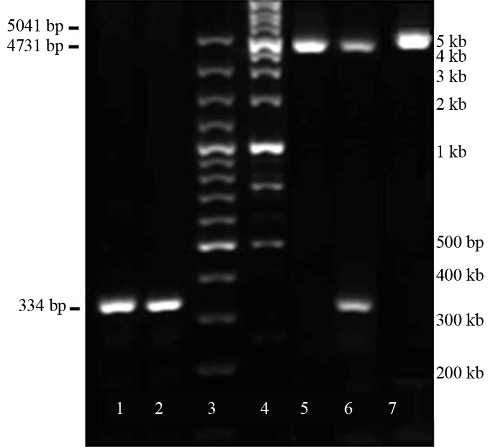 Lane 1 and 2, 334 bp PCR band amplified by specific primers for the insert on the bottom; Lanes 3 and 4 are, 100 bp and 1kbp ladders, respectively; Lane 5, single digestion of pEGFP-C1-Mock digested with EcoRI produced a 5041 bp-fragment; Lane 6, double-digest of pEGFP-C1-miR-375 with EcoRI and BamHI produced 334 bp related to miR-375 precursor insert and 4731 bp vector; Lane 7, single digestion of pEGFP-C1-miR-375 by EcoRI produced a 5041bp fragment.