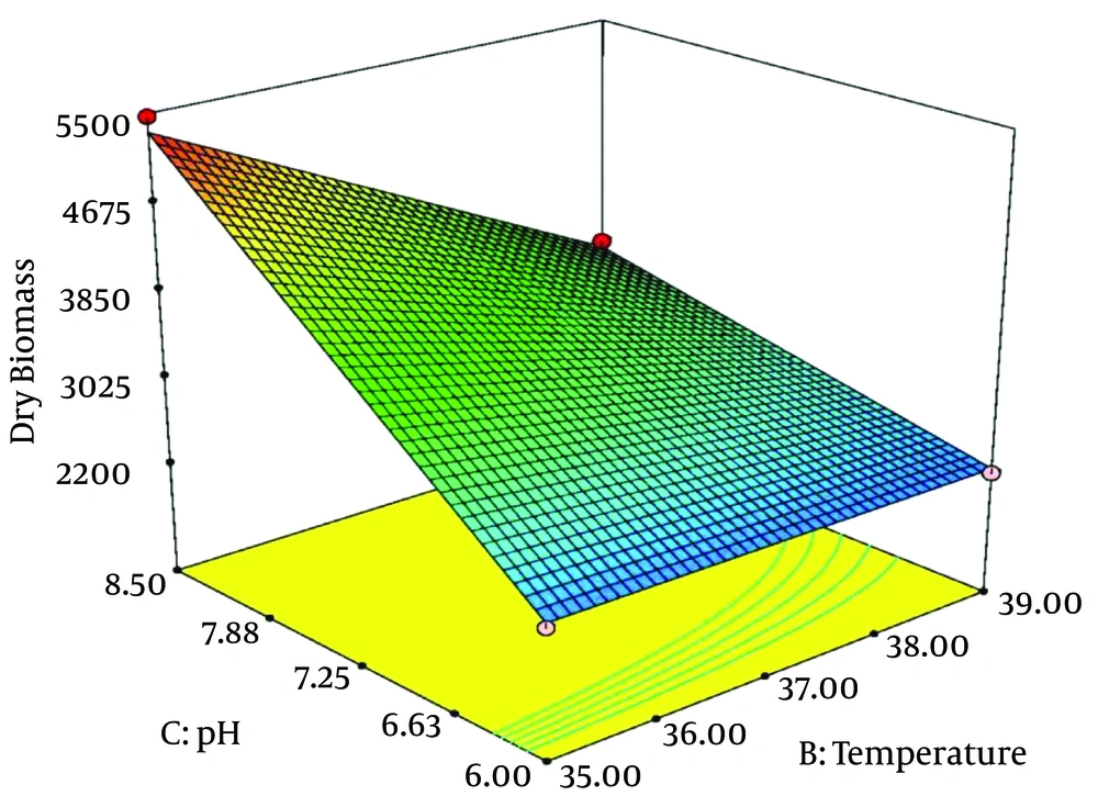 Therefore, in the present study, we used a central composite design (CCD) and a response surface methodology (RSM) to examine the main and/or interactive effects of a factorial combination of pH, temperature, and agitation treatment factors on the growth of Hib and biomass production. Response surface methodology enabled the identification of optimum levels of growth factors in maximizing Hib biomass, and more PRP production as a direct result (10, 13). Response surface methodology guides the plan of the experiments and the parsimonious analysis of data to gain a maximum amount of information most efficiently (14, 15).