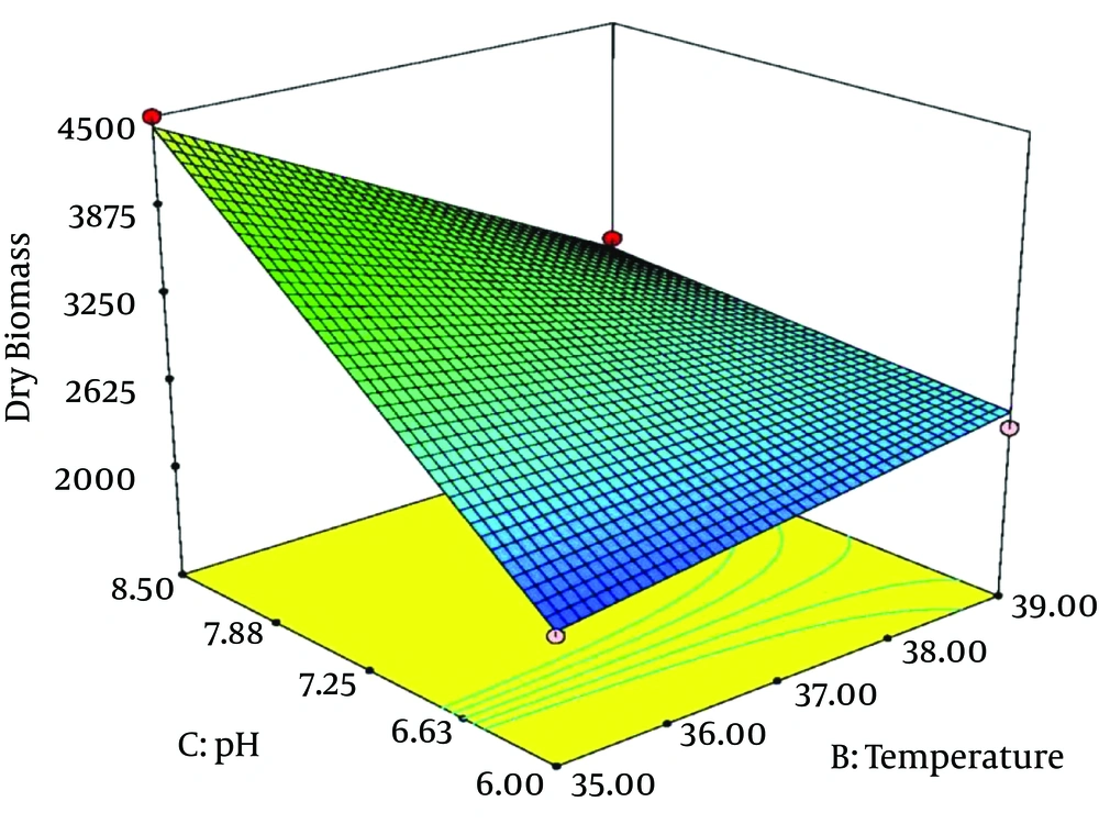 With reference to ANOVA data (Table 3), the pH of culture medium and temperature of incubation are very effective factors in the growth of Hib (p-value equal or < 0.0001). Takagi et al. (10) obtained about 4300 mg/L DCW of Hib (strain GB 3291) in a fermentor with overlay aeration, and 4900 mg/L DCW with 10% air saturated DOT (dissolved oxygen tension), without pH control, and proposed that Hib biomass production is better at low dissolved oxygen if pH is not controlled. Under our study’s conditions, the experiments were carried out in shaking flasks without air-sparged and uncontrolled pH, and we obtained about 5471 mg/L DCW of Hib biomass, after optimization of treatment factors by RSM. This reasonable yield of Hib biomass is in accordance what Takagi et al. (10) had proposed.