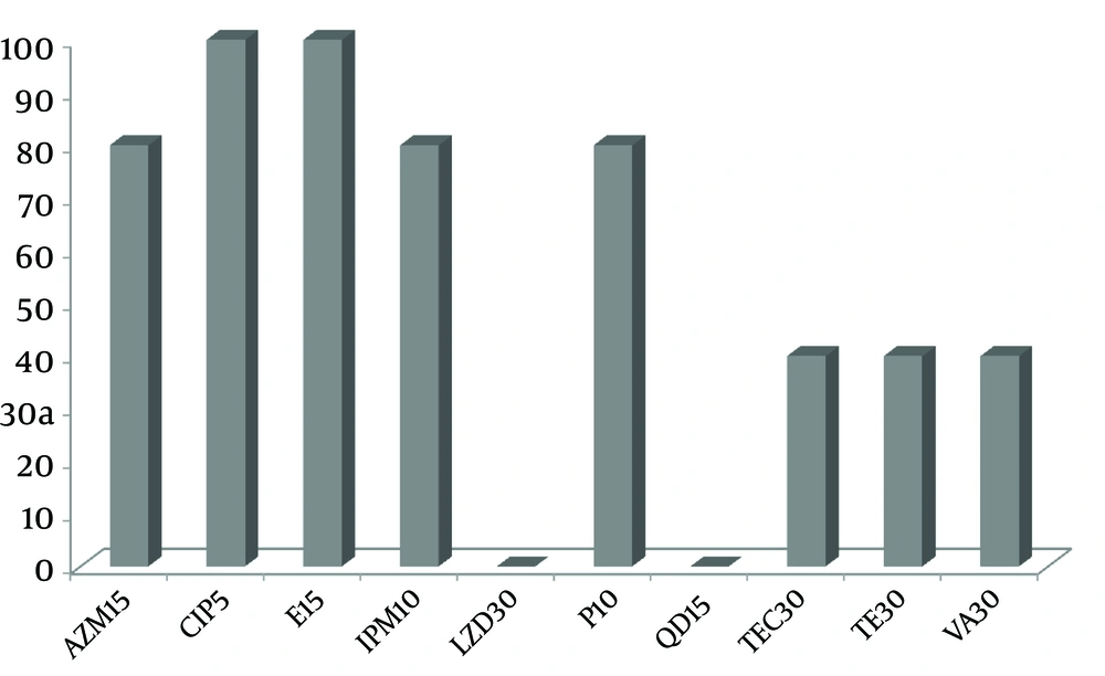 By disc diffusion, high resistance was found in both E. faecalis and E. faecium isolates against different antibiotics that was in accordance with the previous study of Karmarkar et al. (2004) (25). All the isolates were susceptible to linezolid and quinupristin/dalfopristin while resistant against ciprofloxacin and methicillin with MICs. A previous study reported 46.9% enterococci having MIC of 16 - 128 mg/L against ciprofloxacin, which is comparatively a bit less than the present study (26). With methicillin, enterococci are intrinsically resistant as mentioned in a previous study of Jones et al. (2008) (27) thus, all of the strains showed high MICs range.