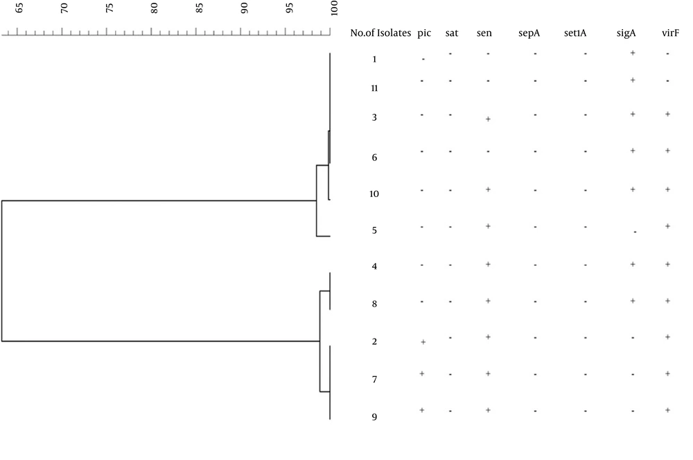 In the present study, eleven EIEC isolates were isolated from 620 stool samples from June 2013 to August 2014. The detection of the virulence genes from 11 EIEC isolates showed that all isolates were positive for ial, whereas 81.8% were positive for the invE and virF genes. The sen, sigA, and pic genes were detected in 72.7%, 63.6%, and 27.3% of the isolates, respectively (Figure 2). None of the isolates were positive for the sat, sepA, or set genes. Using MLVA, a total of 11 isolates were divided into five types. Analysis of the MLVA profiles using UPGMA showed that the EIEC isolates fell into two main clusters, using 90% similarity as the cut-off (Figure 3). In some cases, the patterns of virulence genes were not similar in isolates with the same MLVA type; however, isolates with similar MLVA patterns mostly had similar virulence patterns. For example, isolates 1 and 11, as well as isolates 2, 7, and 9, had identical patterns of virulence genes and similar MLVA patterns (Figure 3).