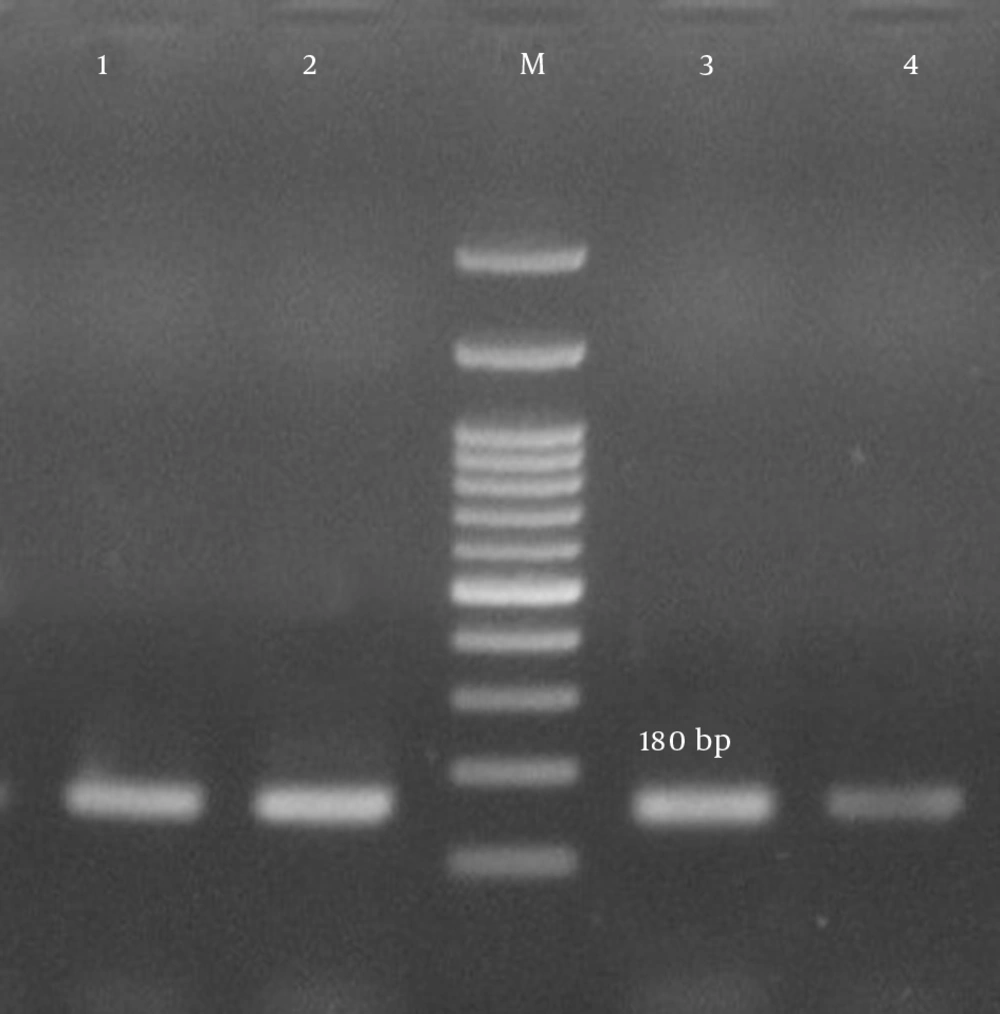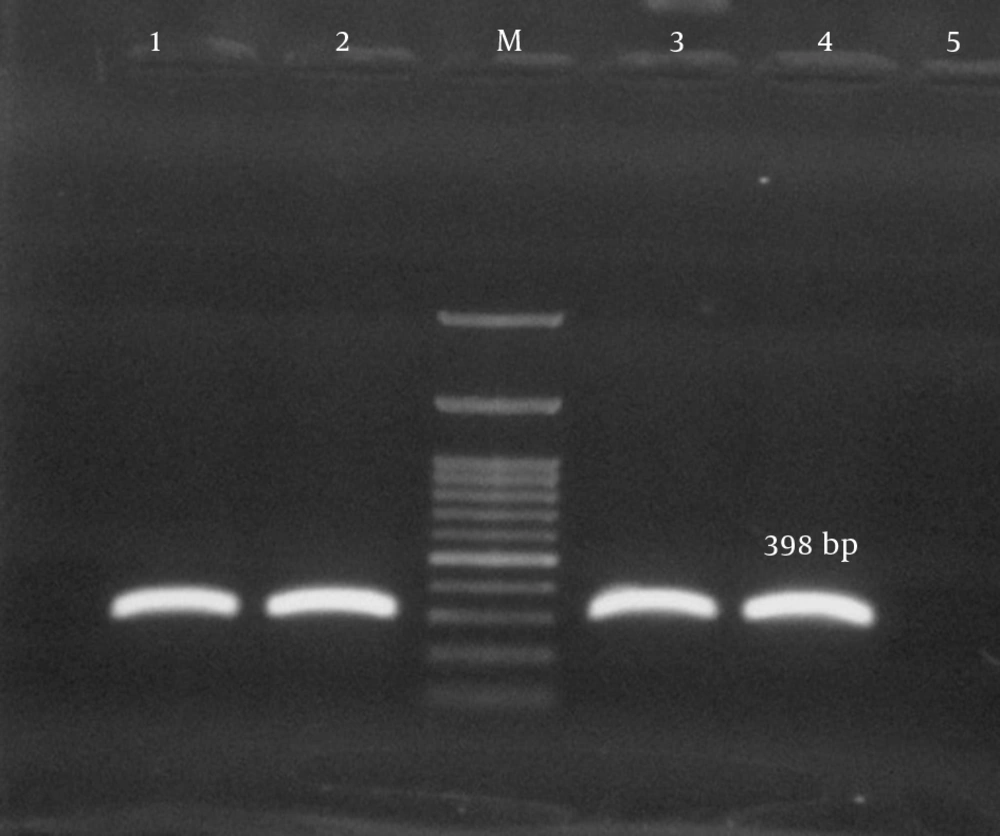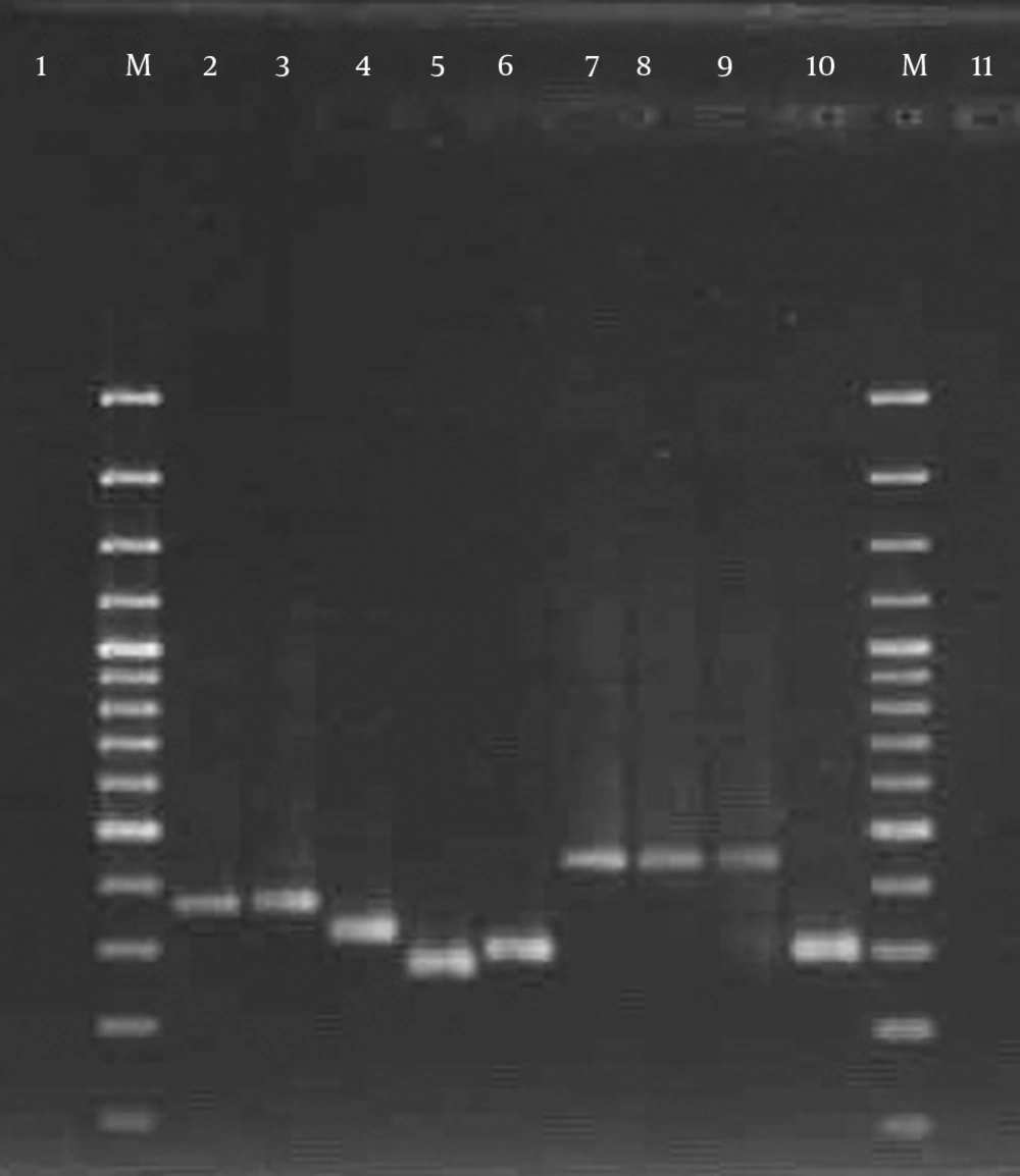 This cross-sectional study was conducted during a six-month period from the first of April 2015 to the end of September 2015. The research was approved by the ethics committee of Shahid Beheshti University of Medical Sciences [No. 1394.157]. All hospitalized patients with S. aureus infections were examined, and 90 S. aureus isolates were recovered from any clinical site of these patients. One isolate per patient was included in the study, and duplicate samples were excluded. All clinical samples were immediately transported to the laboratory upon collection. Standard microbiological procedures, such as colony morphology, Gram staining, growth on mannitol salt agar, and the production of catalase, coagulase, and DNase, were carried out for the presumptive isolation and identification of S. aureus. All isolates were confirmed using polymerase chain reaction (PCR) for the femA and nucA genes (15, 16).