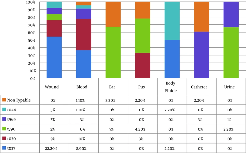 According to the results of the present study, t790 was the third most common spa type in Tehran. These spa types were previously described in a study conducted by Japoni-Nejad and colleagues, who analyzed the molecular characterization of CA-MRSA S. aureus strains from central Iran (9). Though several studies have reported t790 as the predominant spa type (9, 21), other observations on the limited frequency of t790 in different geographic areas also exist (22). Given the high prevalence of t790 in this study, our present findings support the view that this type could be linked to the transfer of S. aureus from the community to hospitals. In our study, we observed a low frequency of the t969 and t044 spa types along with high MDR rates in our isolates. Previous studies in other countries have also reported a low frequency of t969 and t044 spa types in comparison with other spa types, which is in accordance with our results but is not to the same extent (23, 24, 29, 32).