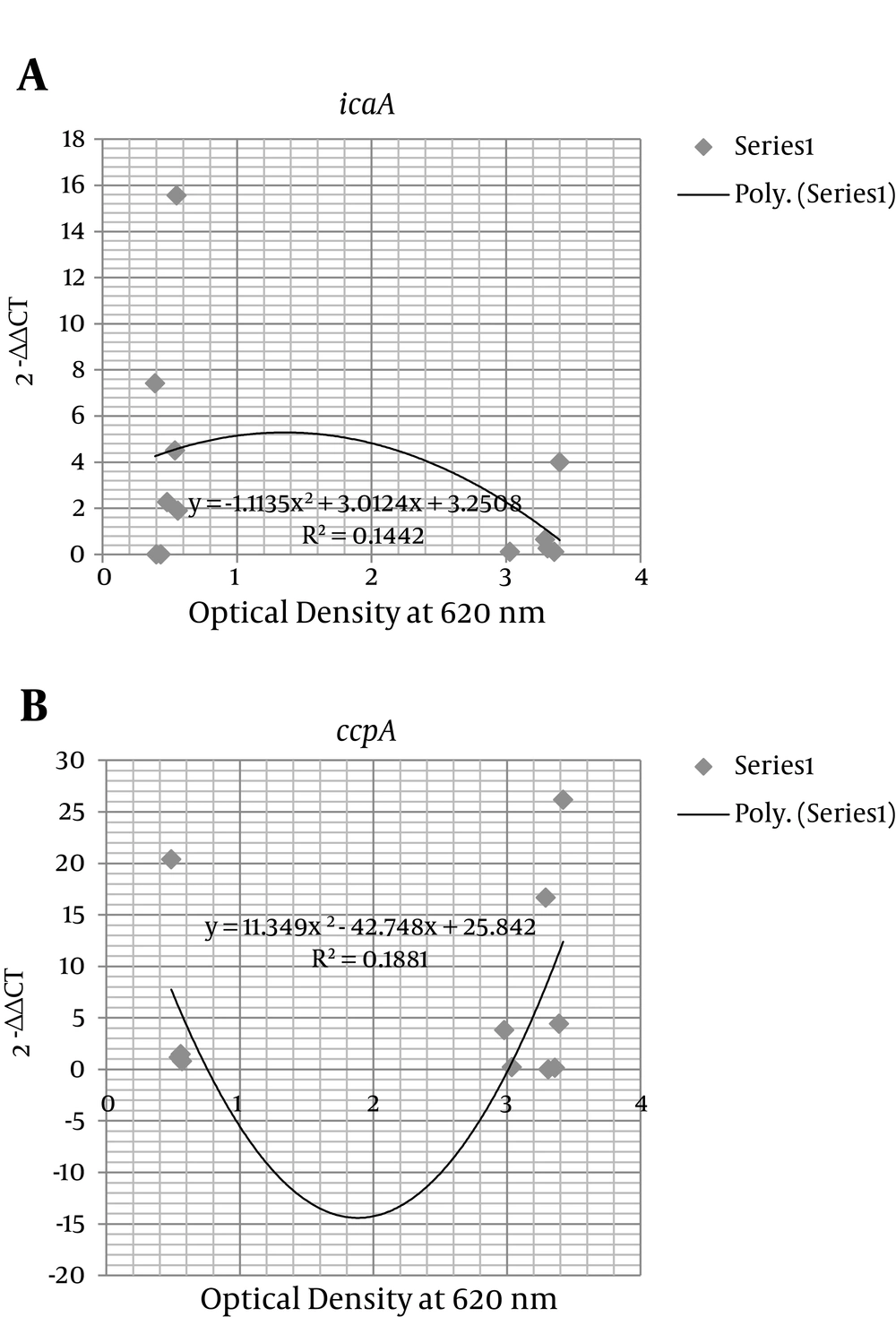 IcaA and ccpA transcriptional levels in biofilm growth were weakly correlated with the O.D. recorded in biofilm assay for studied strains (r2 = 0.14 and r2 = 0.18, respectively) (Figure 2A and 2B). RNAIII transcriptional level in biofilm growth was correlated with the O.D. recorded in biofilm assay for studied strains (r2 = 0.95). According to the graph equation (Figure 2C), the increased expression of RNAIII gene was going step by step with decreased O.D.