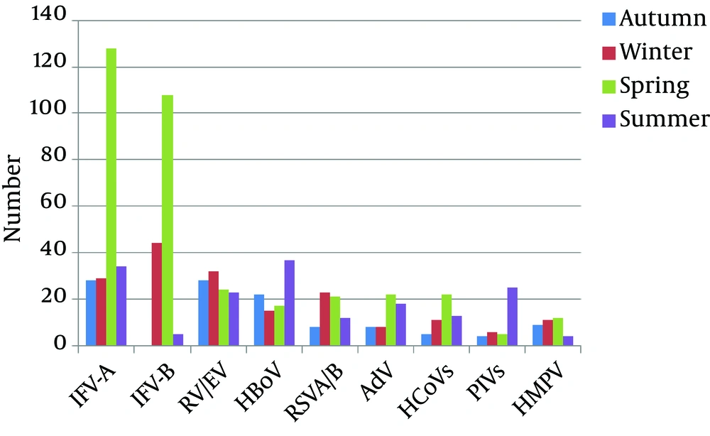 Among the respiratory viruses, IFVs are some of the most important genera due to their epidemic and pandemic potential in terms of public health. IFVs can have different clinical manifestations, from mild upper respiratory tract infections to severe pneumonia resulting in death (21). In this study, IFV-A was the most commonly detected agent, both in children over 5 years of age and in adults (Table 2). In addition, the detection rates of IFV-A and IFV-B in adults were found to be significantly higher than in children. In contrast to our results, Javadi et al. (2) detected the most common agents as RV in the 0 - 4-year-old age group and IFV-B in the 5 - 50-year-old age group in Iran. In another study conducted in the United States, HBoV (in the 0 - 4-year-old age group) and RV (in the 5 - 50-year-old age group) were found to be the most prevalent agents (22). However, Ren et al. (10) and Liao et al. (23) found the most common agent in adults in China to be IFV-A, which was similar to our findings. These results support that the prevalence of respiratory viruses changes based on geographic region and age group.