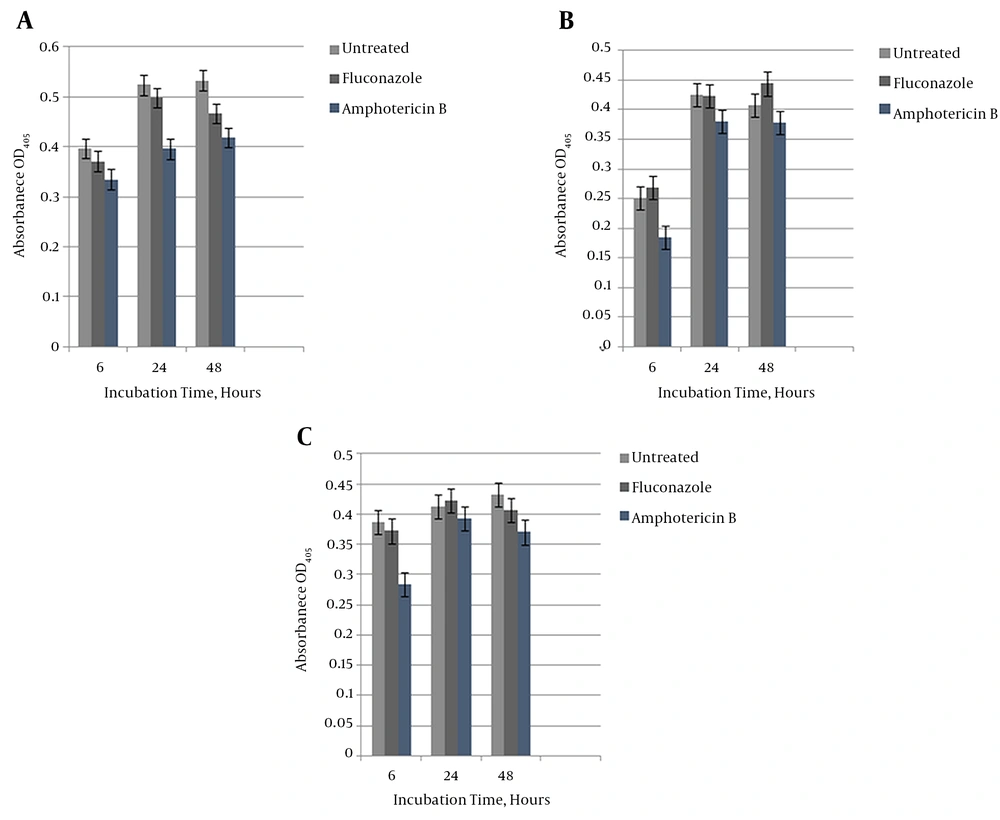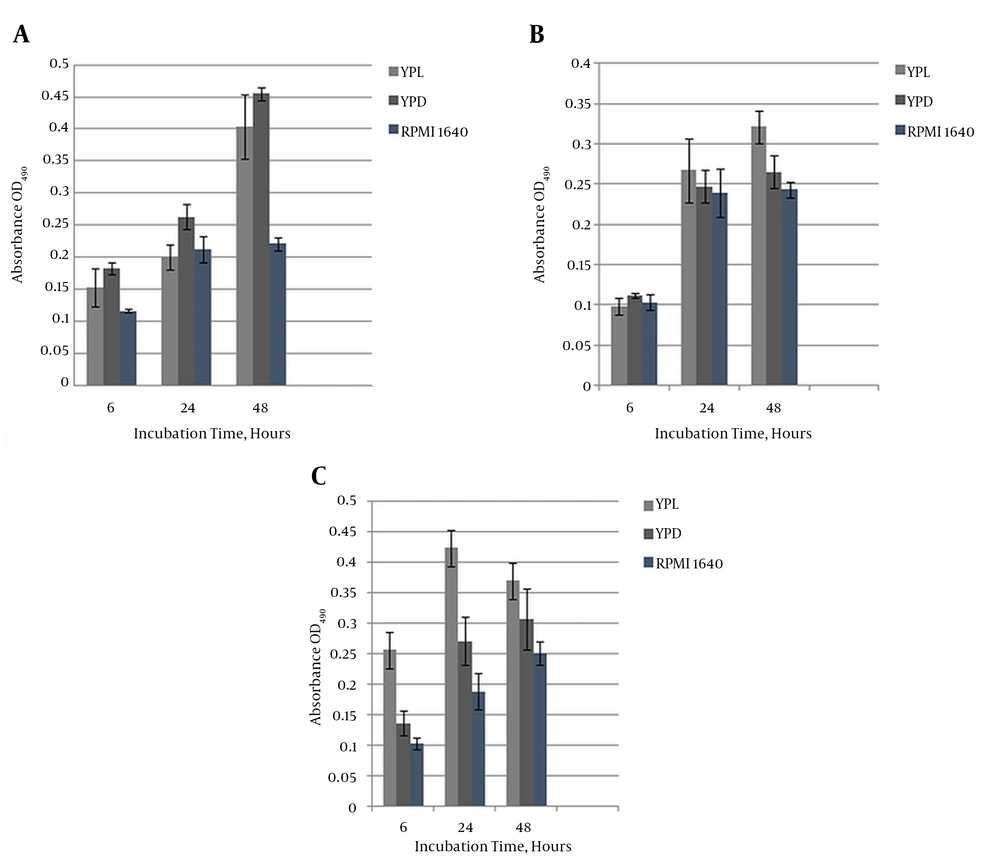 For antifungal susceptibility testing of sessile cells, biofilms that formed on the microtiter plates at the various time intervals (6, 24, and 48 hours) were challenged with antifungal drugs. The media were aspirated off and gently washed twice with sterile PBS, then 100 µL of YPD and YPL broth and RPMI 1640 medium containing serially diluted concentrations of antifungals (fluconazole 256 µg/mL and amphotericin B 16 µg/mL) was added and the plates were incubated for another 24 hours at 37°C. The MTT reduction assay at 405 nm was performed as described (22). The experiment was performed in 2 - 4 replicates.