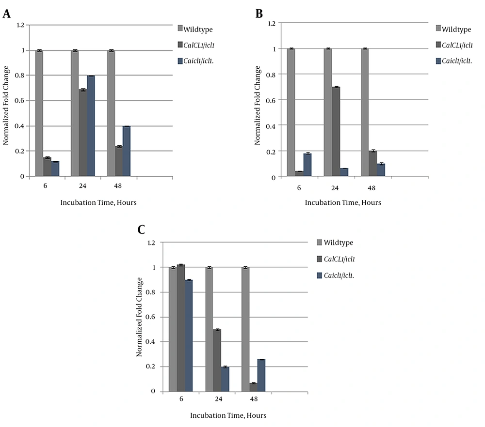 We investigated the extent of ICL’s regulatory role on FKSI, ERG11, and CDR2 at the mRNA expression level using real-time qPCR. ACT1 was used as a housekeeping gene. The expression profiles of ICL1/icl1 and icl1//icl1 were compared to that of the wildtype strain. Figure 7A shows that the expression level of FKSI in the mutants was downregulated compared to the wildtype. FKS1 transcript levels were relatively high at the intermediate phase in the mutants, although no fold to the wildtype was suggested, and expression decreased at maturity. Expression of ERG11 in icl1/icl1 regressed over time, unlike that of ICL1/icl1, which increased at the intermediate stage and regressed at maturity (Figure 7B). The drug efflux-pump level was also reduced with maturation. The ICL1/icl1CDR2 level was higher than that of the wildtype at the early phase and decreased to reference levels at maturity. Overall, the transcript levels of the studied genes were downregulated to the wildtype, as shown in Figure 7C. Therefore, our data show that ICL exerts a substantial regulatory effect on FKS1, ERG11, and CDR2 expression.