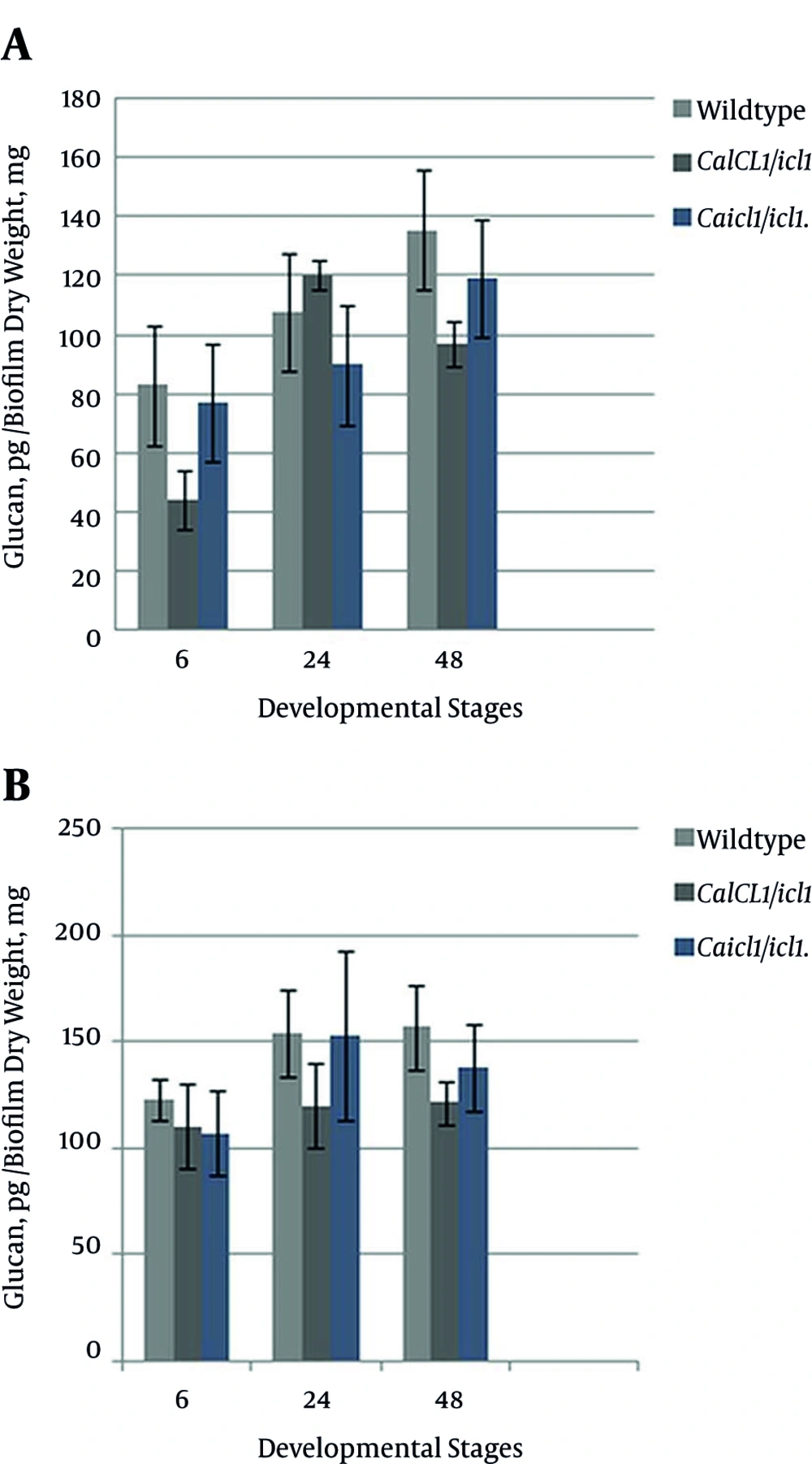A, Quantification of β-1, 3-glucan present in the ECM of wildtype and mutant biofilms not treated with fluconazole at the early, intermediate, and mature phases, respectively; B, Quantification of β-1, 3-glucan present in the ECM of the wildtype and mutant biofilms treated with 128 µg/mL fluconazole at the early, intermediate, and mature phases, respectively.