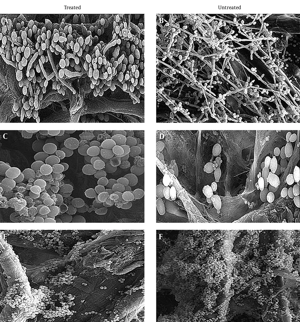 Biofilm growth is a unique virulence trait and defense mechanism of C. albicans that is associated with infectious diseases and the clinical use of implanted medical devices, such as central catheters and intracardiac prosthetic valves. Candida albicans causes life-threatening conditions, such as urinary tract infection and endocarditis, with a mortality rate as high as 30% (10, 13, 14). Despite treatment, such an infection may re-establish itself. Sessile cells are phenotypically and genetically different from free-floating cells. A characteristic attribute of biofilms, unlike planktonics, is resistance to antifungal agents, particularly azole, polyenes, and recently, echinocandins. Candida albicans sessile cell resistivity is always expressed, irrespective of definite phenotypic variation and the expression of specific drug-resistance genes, entailing complex multicellular processes (11, 15, 16). Due to this property, in most clinical cases, replacement of the infected devices is the only treatment option (13, 17, 18). Thus, it is imperative to develop effective strategies for control. Recent research has begun to shed light on how attached microbial communities develop resistance to antifungal agents, proposing various involved mechanisms (13, 14). This peculiar phenotype has been reported by previous studies to be a multifactorial phenomenon not regulated by a singular mechanism, which was confirmed by this study.
