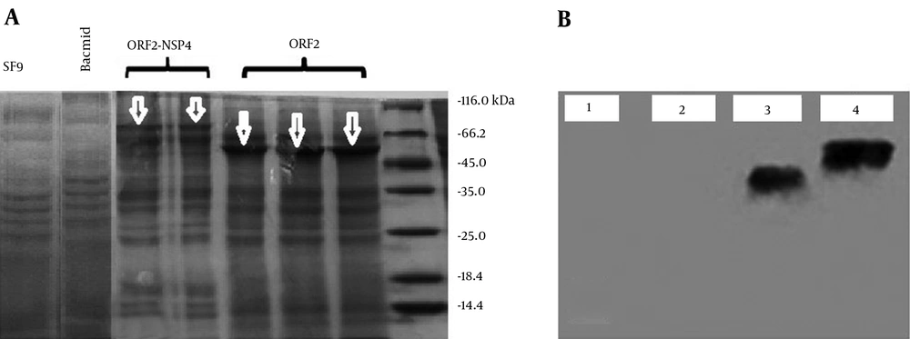 A: Analysis of the expression of truncated ORF2-NSP4 and truncated ORF2 proteins by Sodium Dodecyl Sulphate-Polyacrylmide Gel Electrophoresis. The expressed proteins (truncated ORF2-NSP4 and truncated ORF2 proteins) were analyzed by 12% SDS-PAGE and stained with Coomassie Brilliant Blue. The truncated ORF2 and truncated ORF2-NSP4 proteins were respectively seen at about 56 KDa and 74.5 KDa using a Pierce TM Unstained Protein MW Marker (Thermo Fisher Scientific, USA). B: Expression of truncated ORF2-NSP4 and truncated ORF2 proteins in SF9 cells. The analysis of western blot results showed the size of expressed proteins (truncated ORF2 and truncated ORF2-NSP4 proteins) in baculovirus expression system which were respectively 56 KDa and 74.5 KDa. 1: SF9; 2: Bacmid; 3: Truncated ORF-2; and 4: Truncated ORF2-NSP-4.