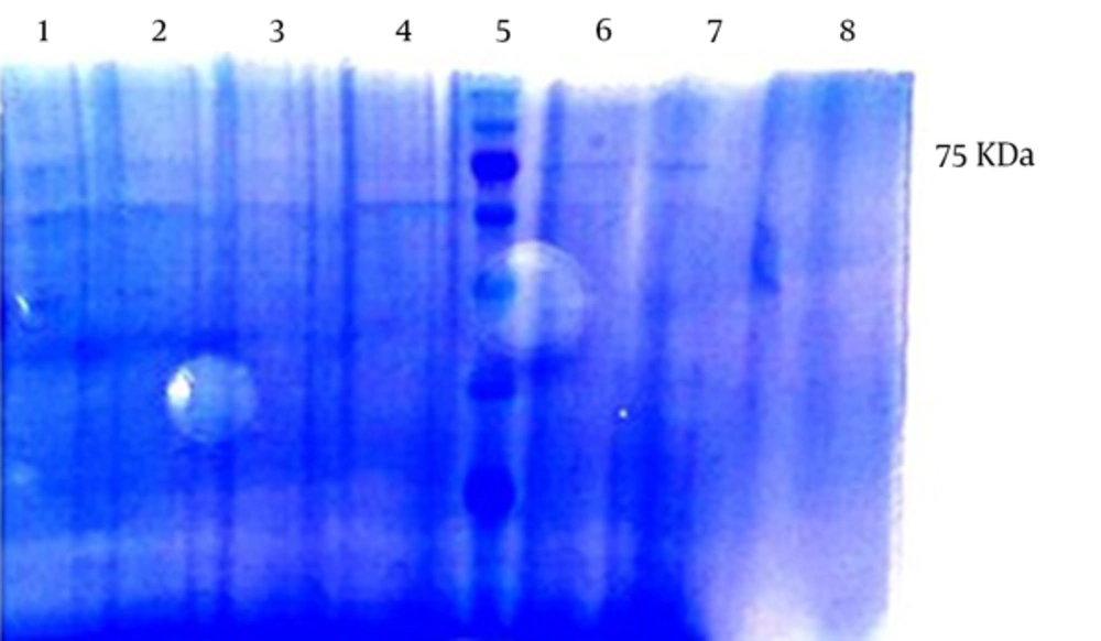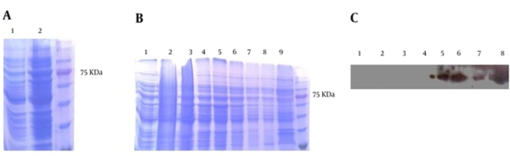 A, the determination of solubility of the ORF2-NSP4 protein by SDS-PAGE. Lane 1, supernatant; and Lane 2, precipitant. The 75 KDa ORF2-NSP4 bond appeared with more concentration in the precipitant. B, the SDS-PAGE analysis of solubilized inclusion bodies of the ORF2-NSP4 protein. Lane 1, the pre induction of the ORF2-NSP4 protein. Lane 2, supernatant of ORF2-NSP4 protein. Lane 3 - 9, washing steps with urea 4M. C, the western blot analysis of solubilized inclusion bodies of the ORF2-NSP4 protein. Lane 1, the pre induction of the ORF2-NSP4 protein. Lane 2, the supernatant of the ORF2-NSP4 protein. Lane 3 - 8, washing steps with urea 4M.