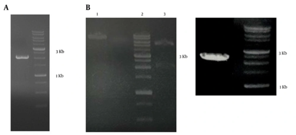 A, the truncated ORF2-NSP4 gene double digested with BamHI and SalI, 2000 bp. B, left, Lane 1, the truncated ORF2-NSP4 single digestion with BamHI; Lane 2, ladder 1 kb; Lane 3, The truncated ORF2-NSP4 double digestion with BamHI and SalI, two bands appeared at 2000 bp and 5369 bp; right, PCR with T7 promotor primers, the ORF2-NSP4 band appeared at 2300 bp.