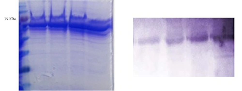 As shown in Figure 1, the SDS-PAGE analysis showed that ORF2-NSP4 protein band appeared on 75 KDa. The western blot analysis confirmed the SDS-PAGE results. The yield of protein was about 2 mg/L.