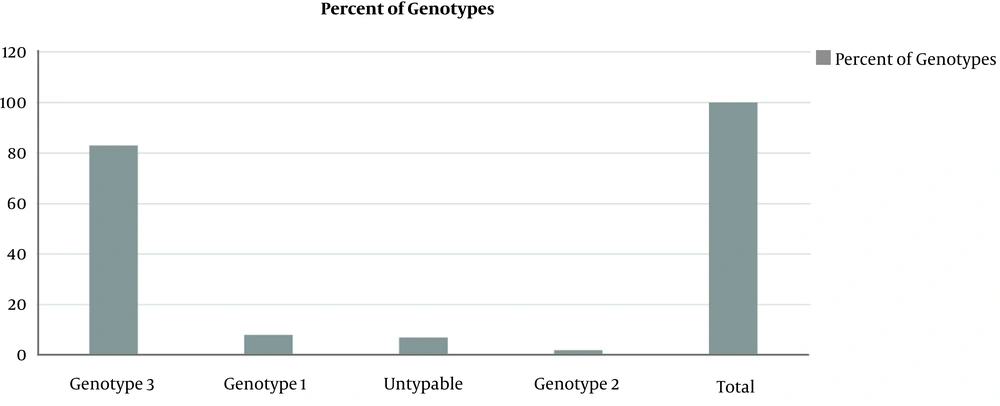 Presence of the ‘untypeable’ genotypes (Figure 1) has also been shown by other studies (16) however, its share in our study (7%) is higher than the previous reports. This might be due to low viral titer in the blood of the patients and absence of viral RNA in the serum samples or limitations of the present assay used, as this assay could detect only major genotypes 1 - 3. Prevalence of genotype 2 (Figure 1) has also been shown in studies (22), however, the percentage of existence of this particular genotype shown in this study is lower than previous studies (1, 16, 23).