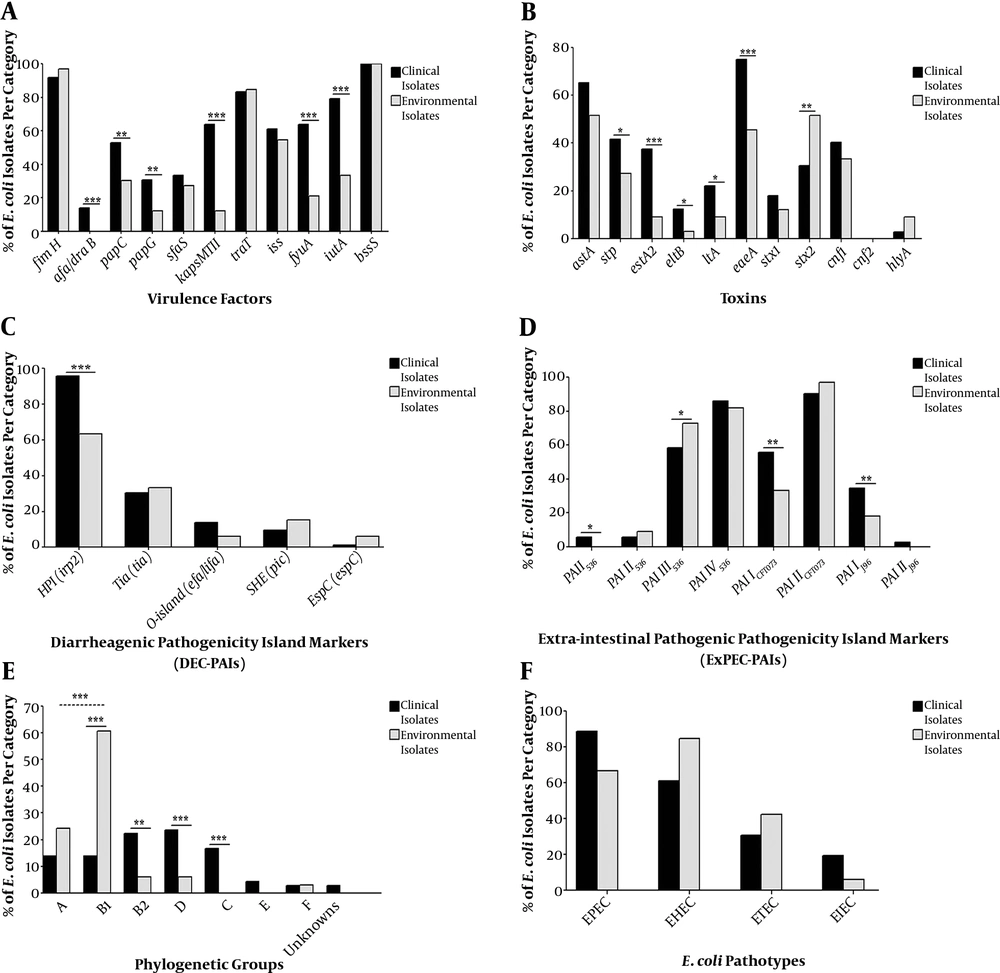 Distribution of; A, virulence; B, toxins; C, DEC PAIs; D, ExPEC PAIs; E, phylogroups; F, pathogroups among clinical and environmental Escherichia coli isolates. DEC, diarrheagenic E. coli; PAIs, pathogenicity associated islands; ExPEC, extra-intestinal pathogenic E. coli; EPEC, enteropathogenic E. coli; EHEC, enterohaemorrhagic E. coli; ETEC, enterotoxigenic E. coli; EIEC, enteroinvasive E. coli; *, significant; **, moderately significant; ***, highly significant.