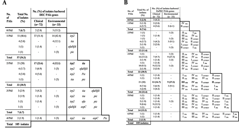 Hierarchical diagram of pathogenicity island markers among 72 clinical and 33 environmental isolates based on non-possession or possession of single/multiple combinations of pathogenicity island markers. PAIs, pathogenicity associated islands. A, diarrheagenic PAI combination; B, extra-intestinal PAI combinations.