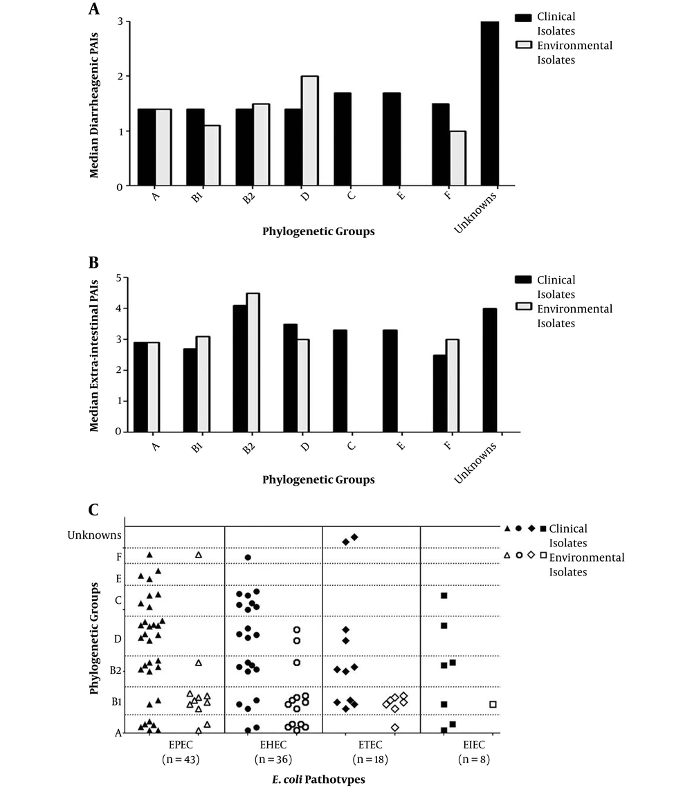 Comparison between clinical and environmental Escherichia coli isolates via relation between phylogeny and A, median DEC PAIs; B, median ExPEC PAIs; C, pathotypes. PAIs, pathogenicity associated islands; solid shapes, indicate clinical isolates; empty shapes, indicate environmental isolates.