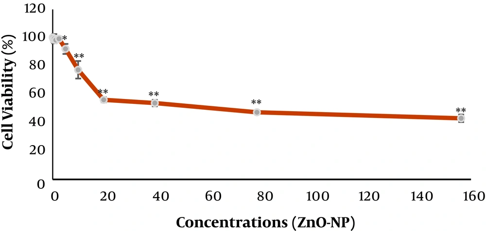 The colorimetric 3-[4, 5-dimethylthiazol-2-yl]-2,5 diphenyl tetrazolium bromide (MTT) assay was used for assessing the cytotoxicity of the ZnO NPs suspensions opposed to the cells. In MTT assay, the reduction of the MTT dye to formazan (an insoluble intracellular blue product) occurs and the dehydrogenases of cells reduce the dye. In briefly, at first, the seeded T24 cells in plates (24-well) were incubated with suspensions for 24 hours. Then the supernatant was moved away, the Dulbecco's Phosphate-Buffered Saline (DPBS) washing of the monolayer was done, and MTT (0.5 mg.mL-1) was added to each well and left to incubate for another 3 hours at -37°C. The resulted absorbance was measured with a plate reader at 570 nm. The assessments were run for three times. The cell viability (percentage of control) was considered as the ratio of absorbance between cell culture that was treated with the suspensions and the untreated control multiplied by 100.
