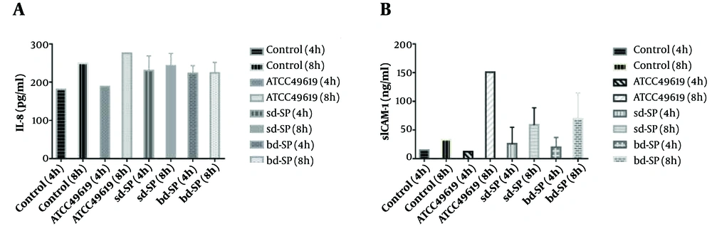 ICAM-1s are distributed to the surface of several cell types including vascular endothelial cells, epithelial cells, lymphocytes, neutrophils, and monocytes, but at low basal levels. Previous studies reported that cross-linking ICAM-1 elicits an association with the actin cytoskeleton and the activation of several intracellular signaling pathways, which triggers the production of numerous cytokines and cell trafficking (19-21). Upon S. pneumoniae invasion, host ICAM-1 may promote the leukocytes’ accumulation towards S. pneumoniae-infected sites, especially extravascular ones (22, 23). Several proinflammatory cytokines including IL-1, IL-11, tumor necrosis factor α (TNF-α), and interferon-γ (IFN-γ) are capable of enhancing the expression of ICAM-1 (24). In the present study, while IL-8 secreted by A549 cells increased and remained stable after four hours of sd-SP or bd-SP stimulation, the sICAM-1 level significantly elevated with the extension of S. pneumoniae stimulation time.