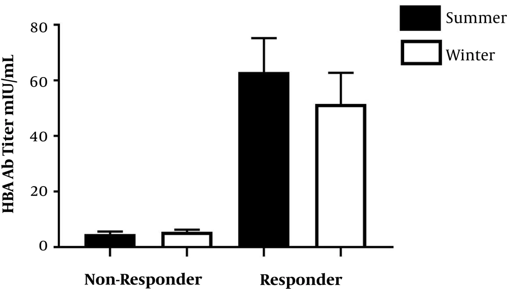 Interestingly, a study demonstrated that leukocyte counts, type 17-related immune mediators, and IL-5 were more in winter newborns than in summer newborns (15). Dopico et al. showed that the immune cell composition varied by season and it might affect the immune system. This study also reported that the expression of the co-regulated pro-inflammatory gene, total monocyte numbers, the concentration of sIL-6R, and CRP in blood samples increased in winter and these increases promoted inflammation and were associated with an increased incidence of rheumatoid arthritis and type 1 diabetes during winter months (23). Indeed, the expression of TLR7, TLR8, and DDX58 (encoding the viral RNA receptor RIG-I) increased in winter months, which predicted the protective immune response to the Yellow Fever vaccine (24). Generally, these studies suggested that immune cell numbers and immune responses could change by season and exposure to seasonal pathogens, which may trigger inflammation or prime the immune system. We also found that the mean value of HBsAb titer was higher in summer-born children than in the winter group, but this relationship was not statistically significant (P value ≥ 0.05).