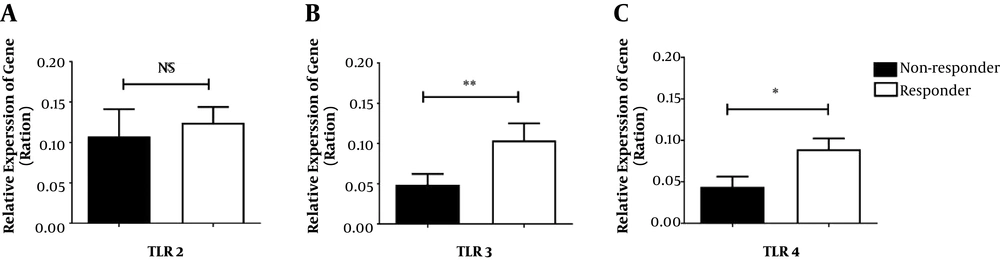 Our study also compared the expression of TLRs in responder and non-responder groups. The expression of TLR 2, 3, and 4 was higher in the responder group than in the non-responder group. Zhang and Lu reported that TLR 2, 3, and 4 had some effects on pro-inflammatory cytokines and the secretion of interferons, which inhibited HBV replication (17). The expression of TLR 2, 3, and 4 in PBMCs of chronic hepatitis B patients can be down-regulated by HBsAg, and it was related to established chronic infection (34). Accordingly, TLR 2, 3, and 4 have some effects on the induction of protective Ab against hepatitis B infection, which confirm our results.