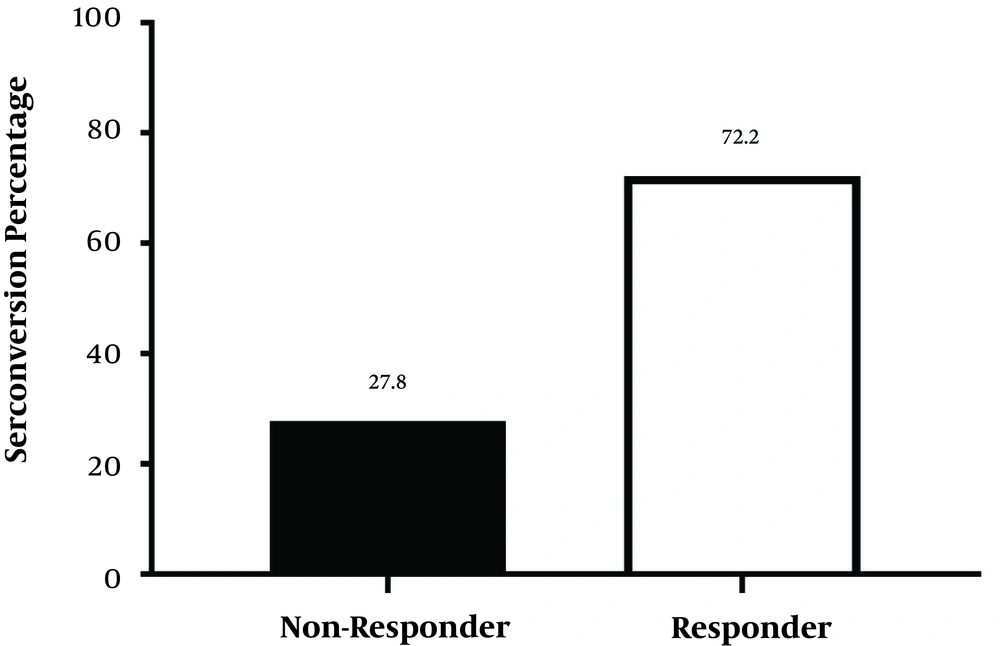 The serum samples were collected from each subject and stored at -80 for enzyme-linked immunosorbent assay (ELISA) (PishtazTeb, Iran). Antibody titer of > 10 mIU/mL and antibody titer of ≤ 10 mIU/mL represented the responder and non-responder groups, respectively.