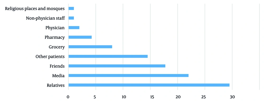 To address this issue, there is a pressing need to improve physician-patient communication and provide physicians with proper training in complementary medicine. With meticulous planning and education efforts, the use of effective and informed complementary medicine practices could become more prevalent in Iran in the future. The study also revealed that most patients learned about various types of CAM through informal networks such as friends, acquaintances, and media outlets before incorporating them into their treatment plans. A significant number of participants purchased herbal medicines or plants from local markets (e.g., perfumeries) and pharmacies. Across studies, perfumeries and pharmacies consistently emerge as the primary sources of complementary medicine. For instance, Paryab and Raeeszadeh (25) reported that in Fars province, 70% of medicinal plant purchases were made through perfumeries. Such findings suggest a high level of trust among people toward perfumeries as suppliers of medicinal plants.