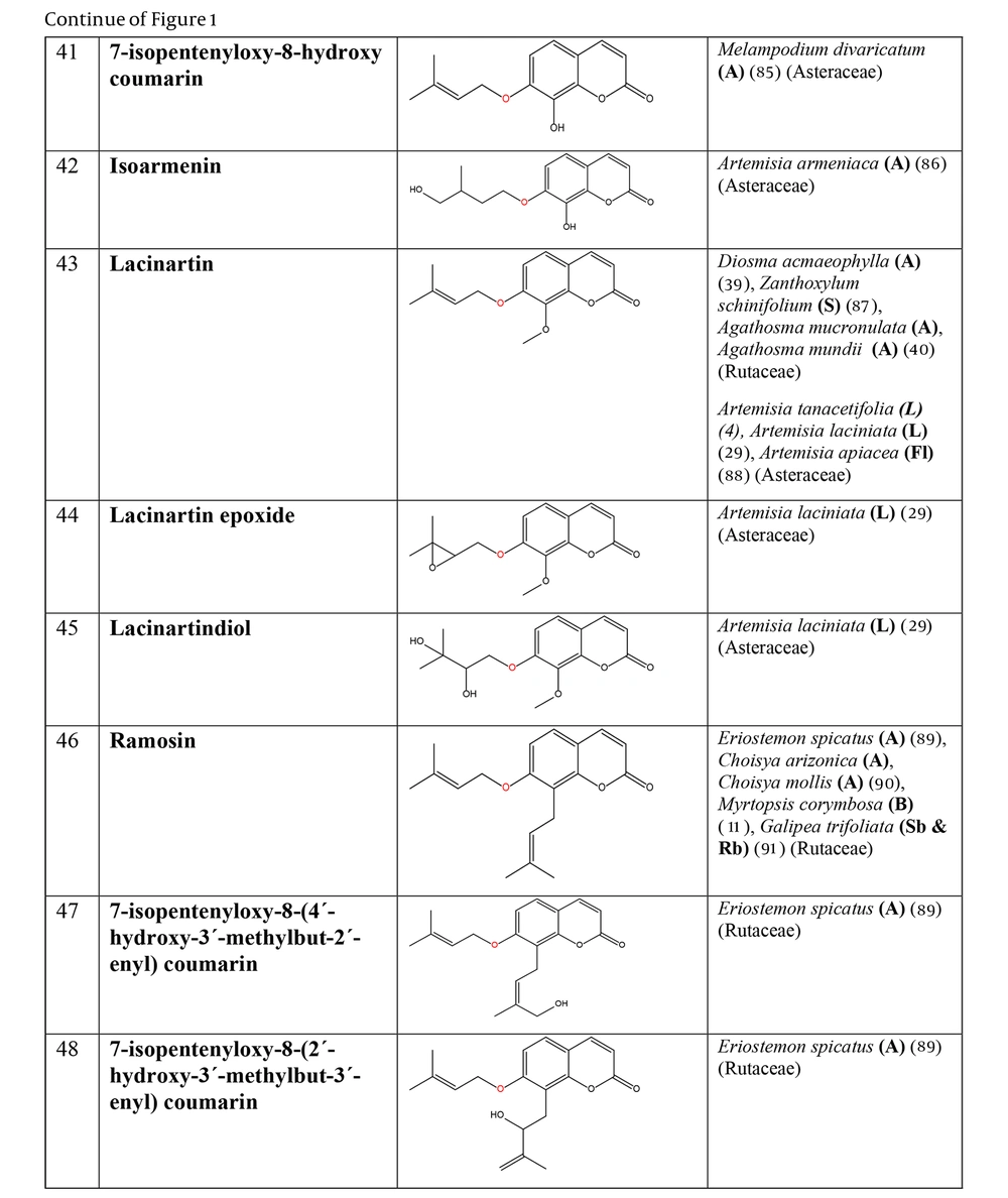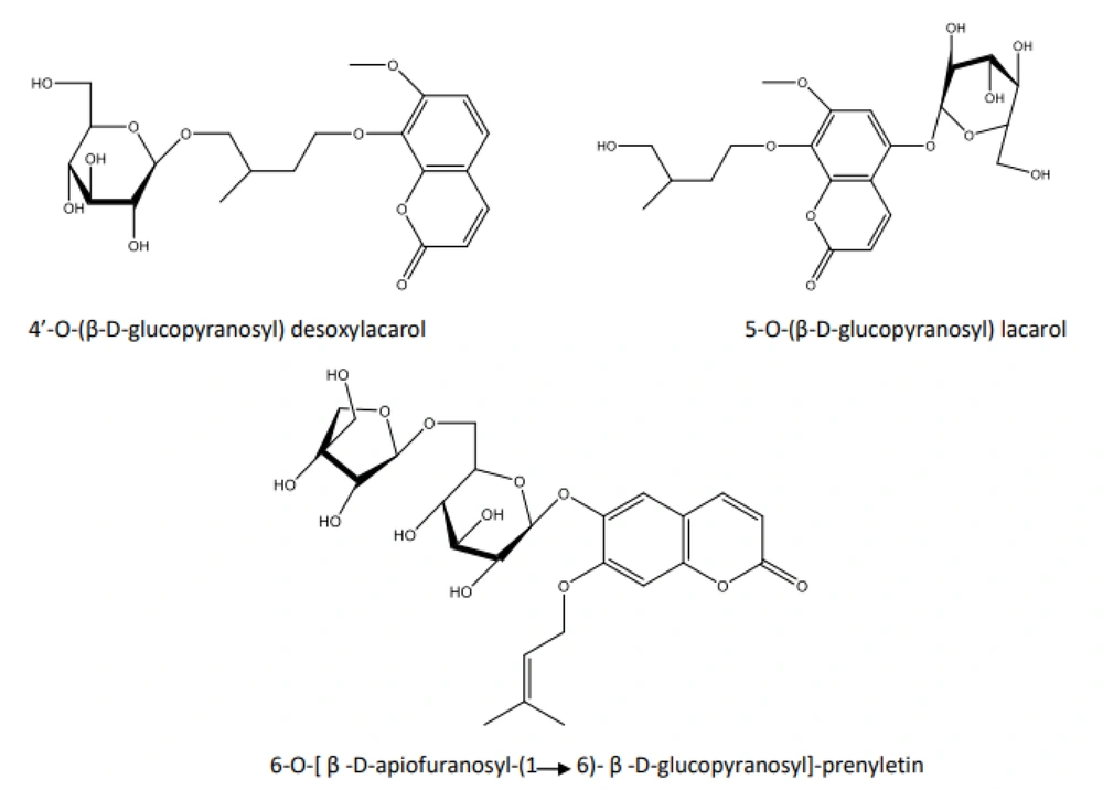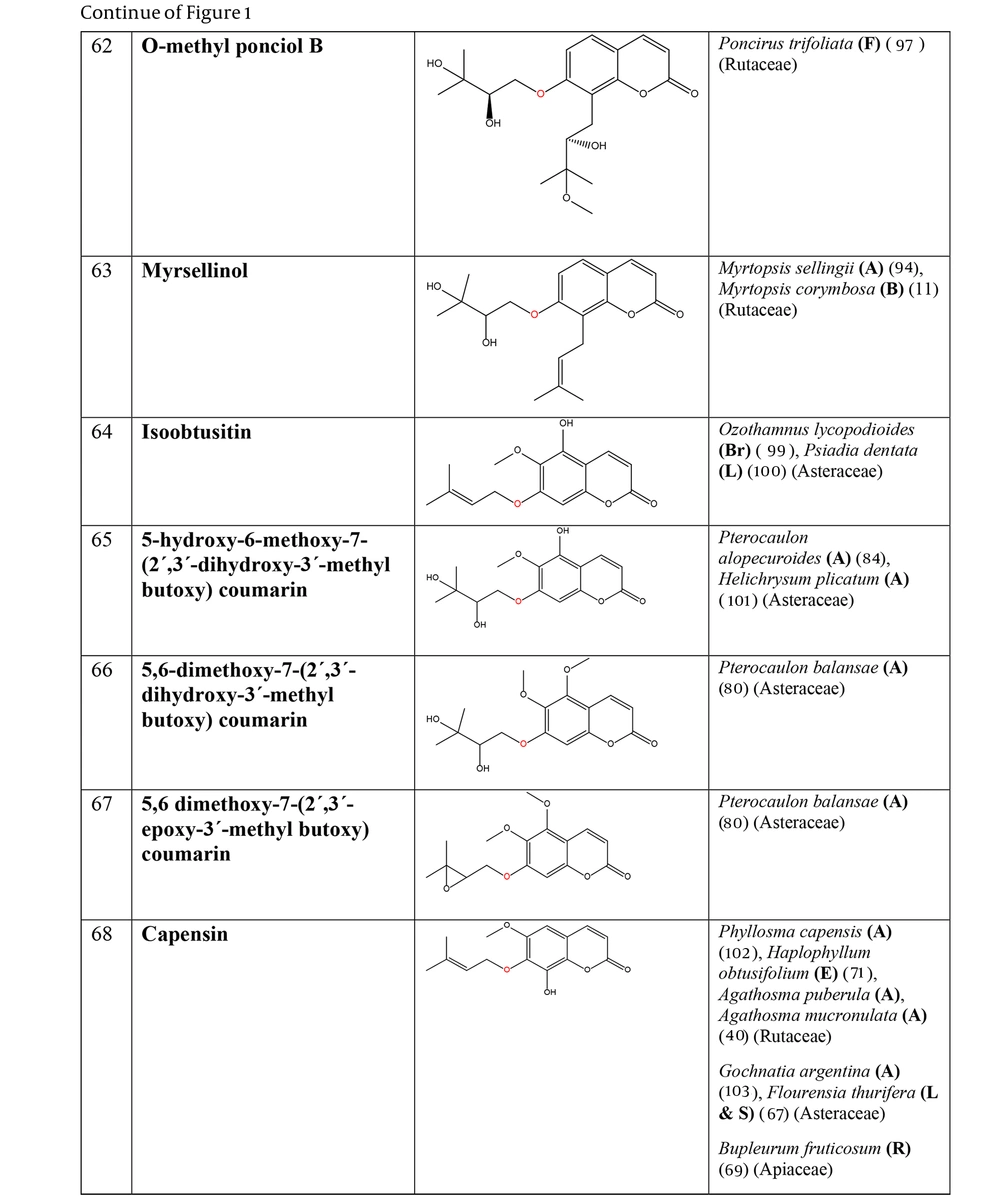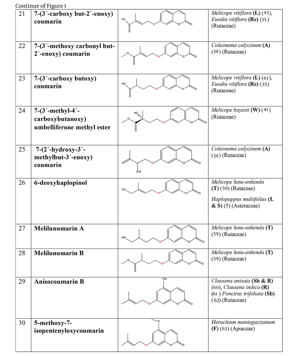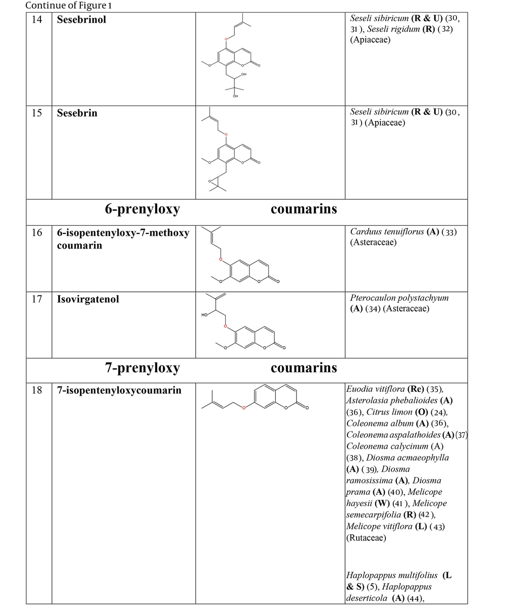 The prenyloxy coumarins are a class of secondary metabolites with promising pharmacological activities. These compounds comprise structures in which a prenyl side chain is linked to the coumarin scaffold through an ethereal bond. In a type of prenyloxy coumarins, the prenyl side chain is an isopentenyl moiety (1) or, in other words, a hemiterpene moiety (C5) (2). Although a hemiterpene is an isoprene group, several five-carbon compounds containing an isopentane skeleton, which can be saturated, unsaturated, repeatedly oxygenated, or methoxylated, are known as hemiterpenes (3). Szabo et al. first used the term “Coumarin-Hemiterpene Ethers” in 1985 for coumarins bearing a hemiterpene moiety by a C-O linkage (4). To date, numerous natural coumarin-hemiterpene ethers (NCHEs) have been reported with various biological activities such as antioxidant (5, 6), anti-inflammatory (7-9), antiviral (10, 11), antifungal (12, 13), cytotoxic, apoptotic (14), and antimutagenic activities (15). There are also reports on the synthesis and biological evaluation of coumarin-hemiterpene ethers (CHEs) that have not been found in nature (16). Although most NCHEs are aglycones, a limited number of glycosylated NCHEs have also been documented (17, 18). However, a comprehensive report on NCHEs and their plant sources has not been available. Additionally, the significance of NCHEs as chemotaxonomic markers has not been thoroughly investigated or discussed.