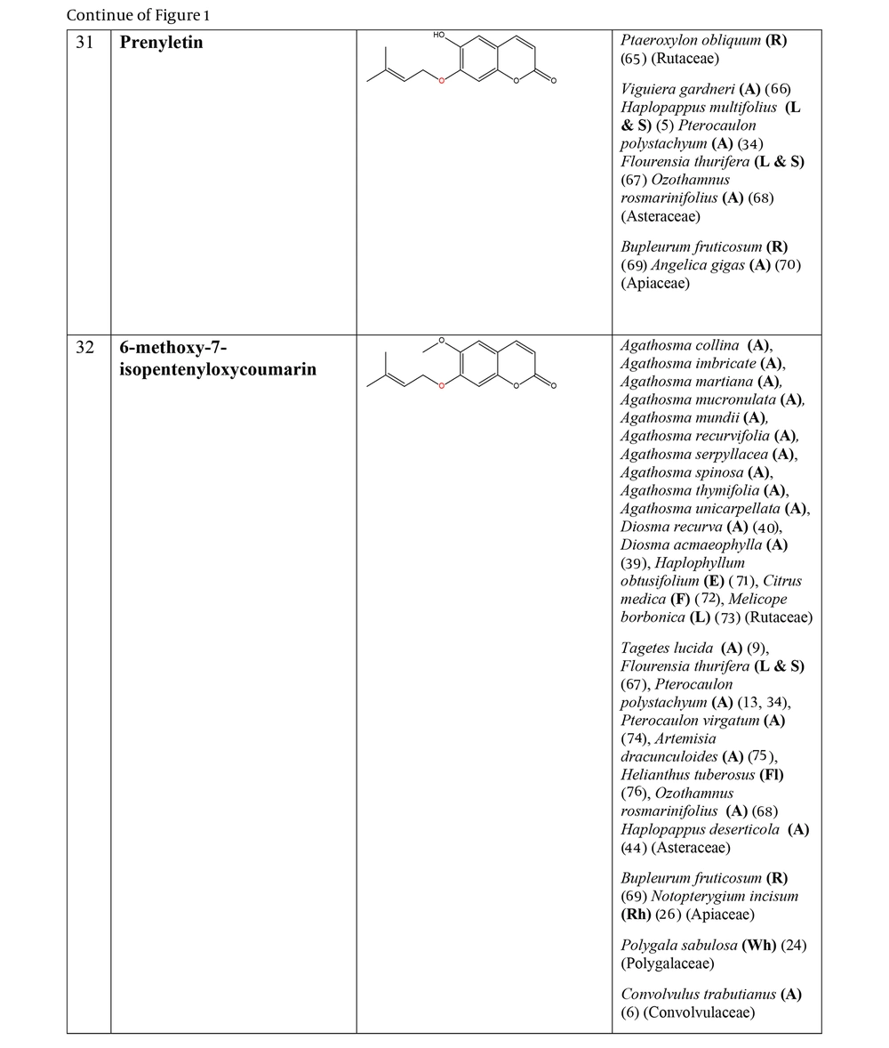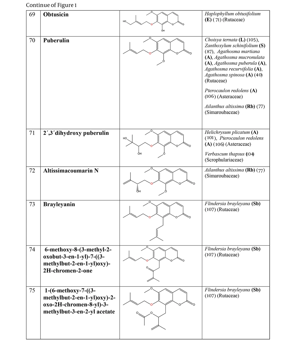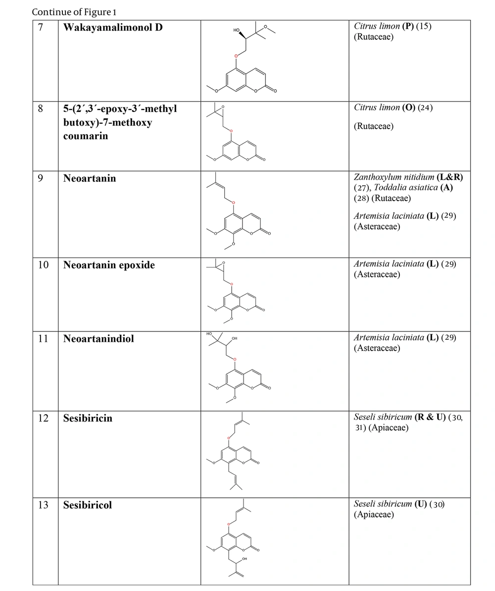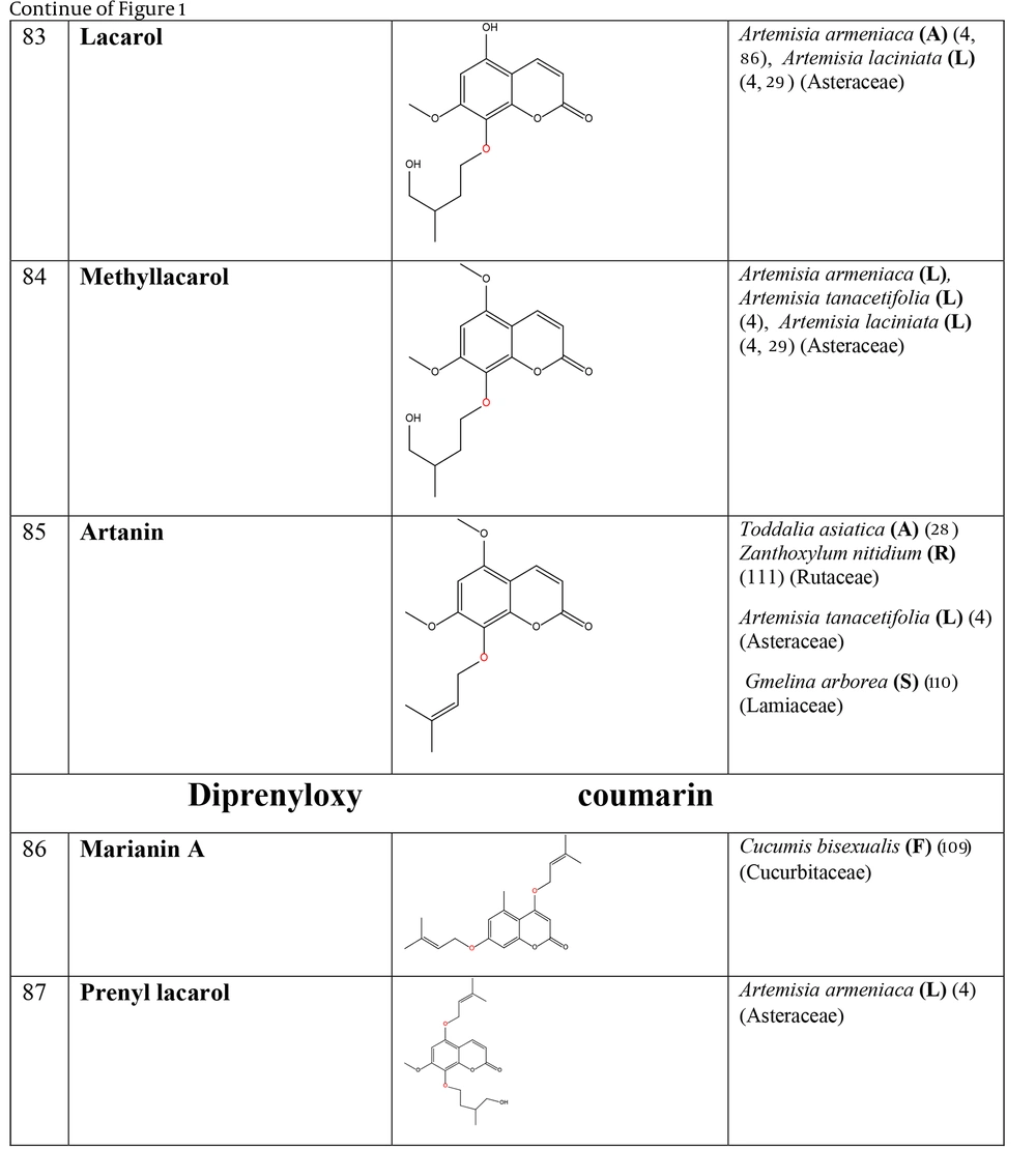 The prenyloxy coumarins are a class of secondary metabolites with promising pharmacological activities. These compounds comprise structures in which a prenyl side chain is linked to the coumarin scaffold through an ethereal bond. In a type of prenyloxy coumarins, the prenyl side chain is an isopentenyl moiety (1) or, in other words, a hemiterpene moiety (C5) (2). Although a hemiterpene is an isoprene group, several five-carbon compounds containing an isopentane skeleton, which can be saturated, unsaturated, repeatedly oxygenated, or methoxylated, are known as hemiterpenes (3). Szabo et al. first used the term “Coumarin-Hemiterpene Ethers” in 1985 for coumarins bearing a hemiterpene moiety by a C-O linkage (4). To date, numerous natural coumarin-hemiterpene ethers (NCHEs) have been reported with various biological activities such as antioxidant (5, 6), anti-inflammatory (7-9), antiviral (10, 11), antifungal (12, 13), cytotoxic, apoptotic (14), and antimutagenic activities (15). There are also reports on the synthesis and biological evaluation of coumarin-hemiterpene ethers (CHEs) that have not been found in nature (16). Although most NCHEs are aglycones, a limited number of glycosylated NCHEs have also been documented (17, 18). However, a comprehensive report on NCHEs and their plant sources has not been available. Additionally, the significance of NCHEs as chemotaxonomic markers has not been thoroughly investigated or discussed.