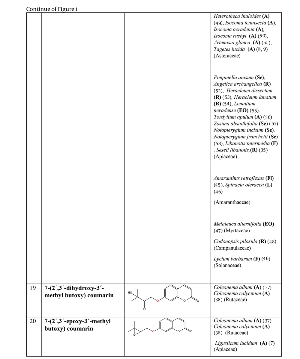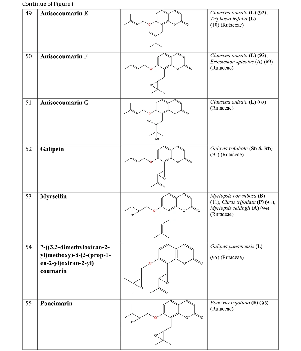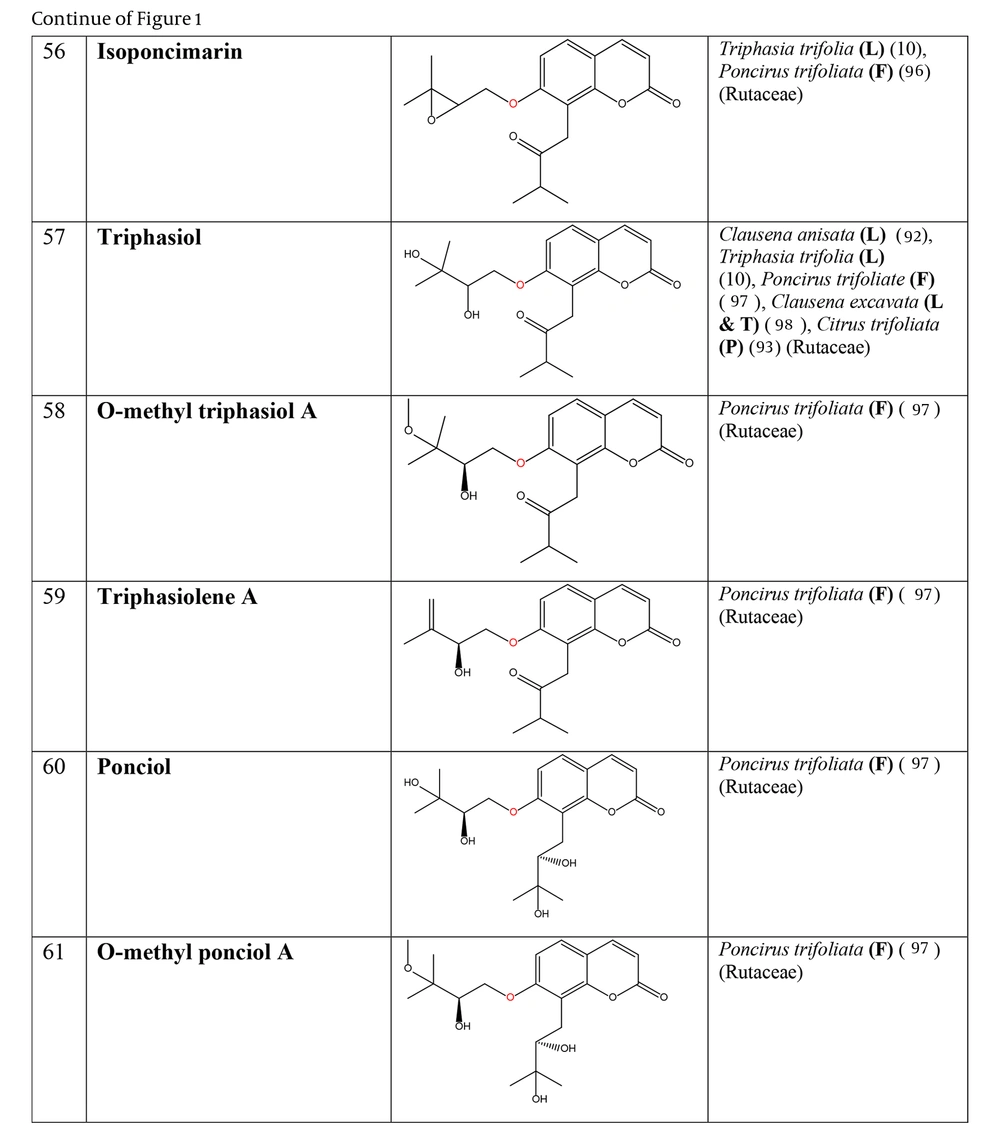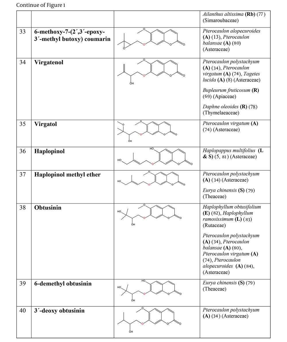 The prenyloxy coumarins are a class of secondary metabolites with promising pharmacological activities. These compounds comprise structures in which a prenyl side chain is linked to the coumarin scaffold through an ethereal bond. In a type of prenyloxy coumarins, the prenyl side chain is an isopentenyl moiety (1) or, in other words, a hemiterpene moiety (C5) (2). Although a hemiterpene is an isoprene group, several five-carbon compounds containing an isopentane skeleton, which can be saturated, unsaturated, repeatedly oxygenated, or methoxylated, are known as hemiterpenes (3). Szabo et al. first used the term “Coumarin-Hemiterpene Ethers” in 1985 for coumarins bearing a hemiterpene moiety by a C-O linkage (4). To date, numerous natural coumarin-hemiterpene ethers (NCHEs) have been reported with various biological activities such as antioxidant (5, 6), anti-inflammatory (7-9), antiviral (10, 11), antifungal (12, 13), cytotoxic, apoptotic (14), and antimutagenic activities (15). There are also reports on the synthesis and biological evaluation of coumarin-hemiterpene ethers (CHEs) that have not been found in nature (16). Although most NCHEs are aglycones, a limited number of glycosylated NCHEs have also been documented (17, 18). However, a comprehensive report on NCHEs and their plant sources has not been available. Additionally, the significance of NCHEs as chemotaxonomic markers has not been thoroughly investigated or discussed.