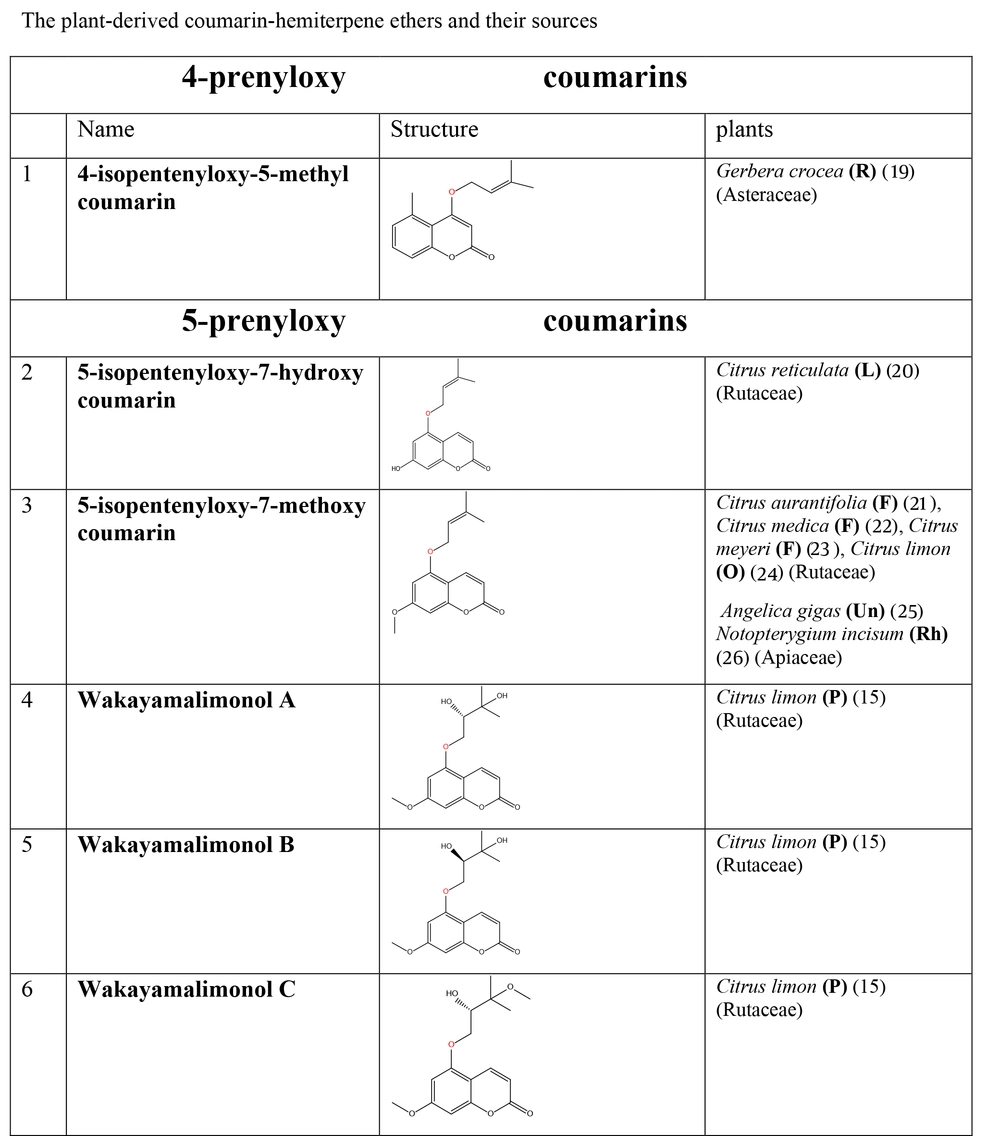The plant-derived coumarin-hemiterpene ethers (CHEs) and their sources (Abbreviations: A, aerial parts; B, bark; Br, branches; E, epigeal parts; Eo, essential oil; F, fruits; Fl, flowers; L, leaves; O, oil; P, peels; R, root; Rb, root barks; Re, resin; Rh, rhizome; S, stems; Sb, stem bark; Se, seed; T, twigs; U, umbls; Un, underground parts; W, wood; Wh, whole herb) (8, 9, 35, 45-58).