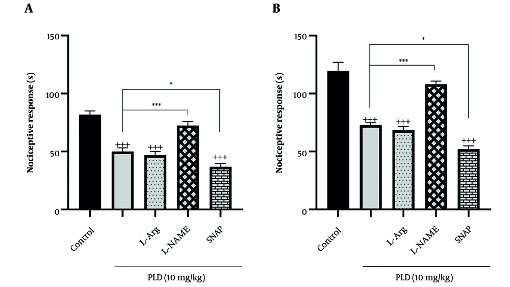 ![The anti-nociceptive impacts of polydatin (10 mg/kg) in the presence of L-arginine (L-Arg, 100 mg/kg), N(gamma)-nitro-l-arginine methyl ester [L-NAME, 30 mg/kg, nitric oxide (NO) inhibitor], and S-nitroso-N-acetylpenicillamine (SNAP, 1 mg/kg, NO donor) in male mice during A, primary phase (5 minutes); and B, secondary phase (15 minutes) of the formalin test (the data provided is represented as mean ± SEM employing one-way ANOVA and Tukey's test; n = 6; +++P < 0.001 vs. control groups, *P < 0.05, ***P < 0.001 vs. polydatin 10 mg/kg group; abbreviation: PLD, polydatin). The anti-nociceptive impacts of polydatin (10 mg/kg) in the presence of L-arginine (L-Arg, 100 mg/kg), N(gamma)-nitro-l-arginine methyl ester [L-NAME, 30 mg/kg, nitric oxide (NO) inhibitor], and S-nitroso-N-acetylpenicillamine (SNAP, 1 mg/kg, NO donor) in male mice during A, primary phase (5 minutes); and B, secondary phase (15 minutes) of the formalin test (the data provided is represented as mean ± SEM employing one-way ANOVA and Tukey's test; n = 6; +++P < 0.001 vs. control groups, *P < 0.05, ***P < 0.001 vs. polydatin 10 mg/kg group; abbreviation: PLD, polydatin).](https://services.brieflands.com/cdn/serve/3170d/38b7ea188dc3dd85debe161b4cdd2899aa932cb0/jjnpp-20-4-163665-i004-preview.webp)