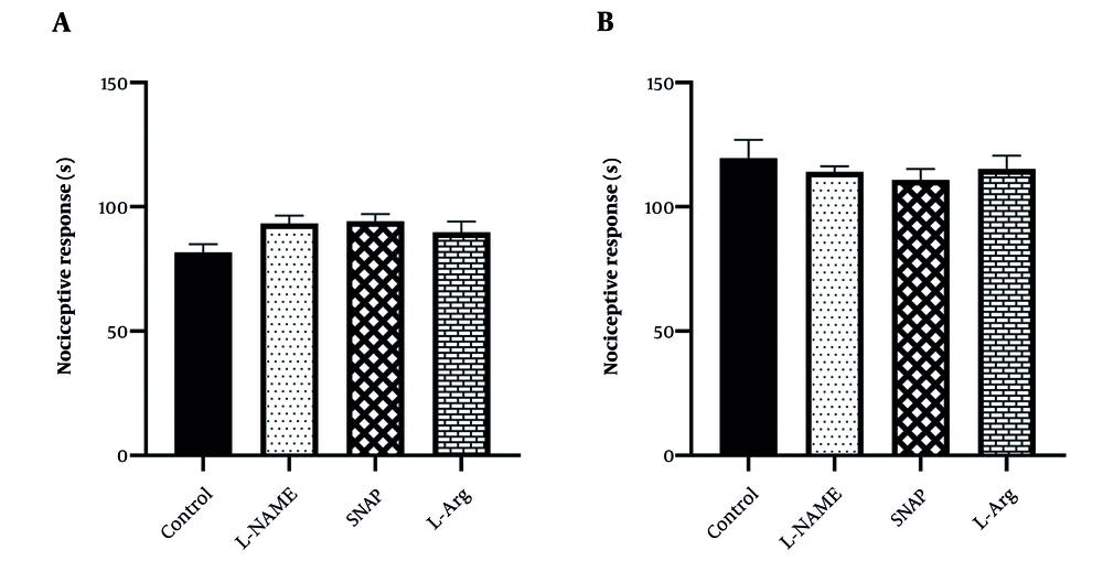 ![The anti-nociceptive impacts of L-arginine [L-Arg, 100 mg/kg, intraperitoneally (i.p.)], N(gamma)-nitro-l-arginine methyl ester [L-NAME, 30 mg/kg, i.p., nitric oxide (NO) inhibitor];, and S-nitroso-N-acetylpenicillamine (SNAP, 1 mg/kg, i.p., NO donor) in both phases of the formalin test in male mice during A, primary phase (5 minutes); and B, secondary phases (15 minutes; the data provided is represented as mean ± SEM employing one-way ANOVA and Tukey's test; n = 6). The anti-nociceptive impacts of L-arginine [L-Arg, 100 mg/kg, intraperitoneally (i.p.)], N(gamma)-nitro-l-arginine methyl ester [L-NAME, 30 mg/kg, i.p., nitric oxide (NO) inhibitor];, and S-nitroso-N-acetylpenicillamine (SNAP, 1 mg/kg, i.p., NO donor) in both phases of the formalin test in male mice during A, primary phase (5 minutes); and B, secondary phases (15 minutes; the data provided is represented as mean ± SEM employing one-way ANOVA and Tukey's test; n = 6).](https://services.brieflands.com/cdn/serve/3170d/7cabfecce90a8c52483971deb04494c4cef0aea4/jjnpp-20-4-163665-i005-preview.webp)