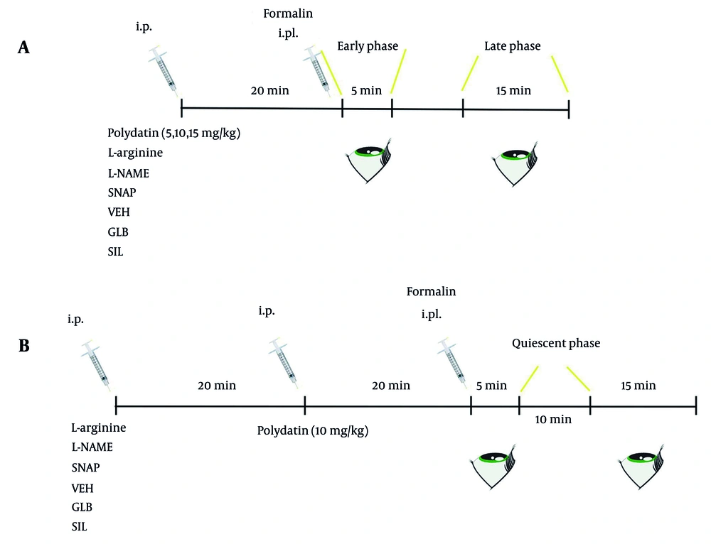 There are several systems for categorizing pain; the most common of them are acute and chronic pain. After tissue injury, acute pain develops rapidly and lasts just a short time. Chronic pain, on the other hand, is associated with tissue injury, has a longer duration than acute pain, and conventional medications may be ineffectual or have side effects (1). For example, nonsteroidal anti-inflammatory drugs (NSAIDs) cause gastrointestinal issues, including small bowel enteropathy and foregut symptoms, such as peptic ulcer disease (2). In addition, pain is classified as nociceptive or neuropathic based on neuronal involvement. The initiation of primary nociceptive afferents by current or prospective tissue-damaging stimuli causes nociceptive pain, also known as physiologic pain. Nociceptive pain occurs when sensory receptors in intact visceral and somatic tissues are activated, so large nerve integrity is retained. In contrast, neuropathic pain typically involves nerve damage or dysfunction, which disrupts normal nerve structure and function (3). The formalin test refers to the quantification of nociceptive behaviors in response to intradermal/subcutaneous (S.C.) formaldehyde injected into the plantar/dorsal hindpaw of rodents (4).
